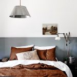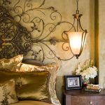 Sa susunod na yugto ng pagguhit ng proyekto sa disenyo ng silid, kinakailangang mag-isip sa sistema ng ilaw. Ito ay kanais-nais na ang silid ay may hindi bababa sa 2 ilaw na mapagkukunan. Ang pinakamahusay na pagpipilian para sa isang silid-tulugan ay magiging isang chandelier sa kisame at mga lampara sa kama. Huwag kalimutan na ang bawat gumaganang lugar ng silid ay dapat magkaroon ng magkakahiwalay na pag-iilaw. Ang mga sconce, luminaires na naka-mount sa dingding at mga recessed ceiling lamp ay dapat gamitin bilang karagdagan. Ang huling pagpipilian ay maaaring mai-install sa ulo ng kama.