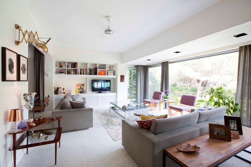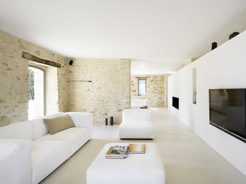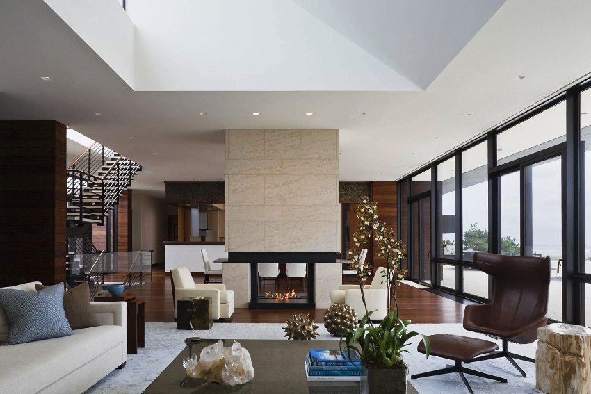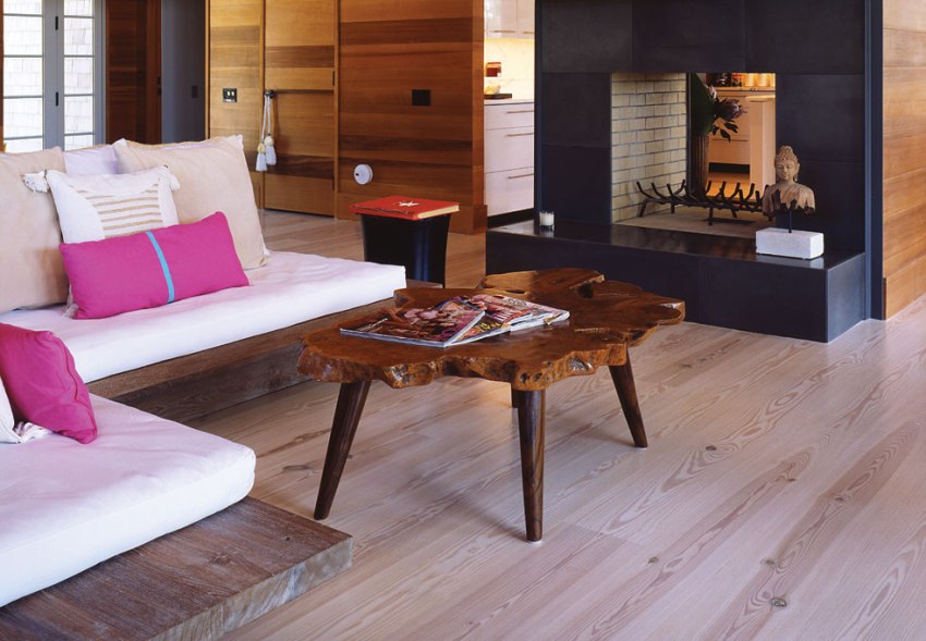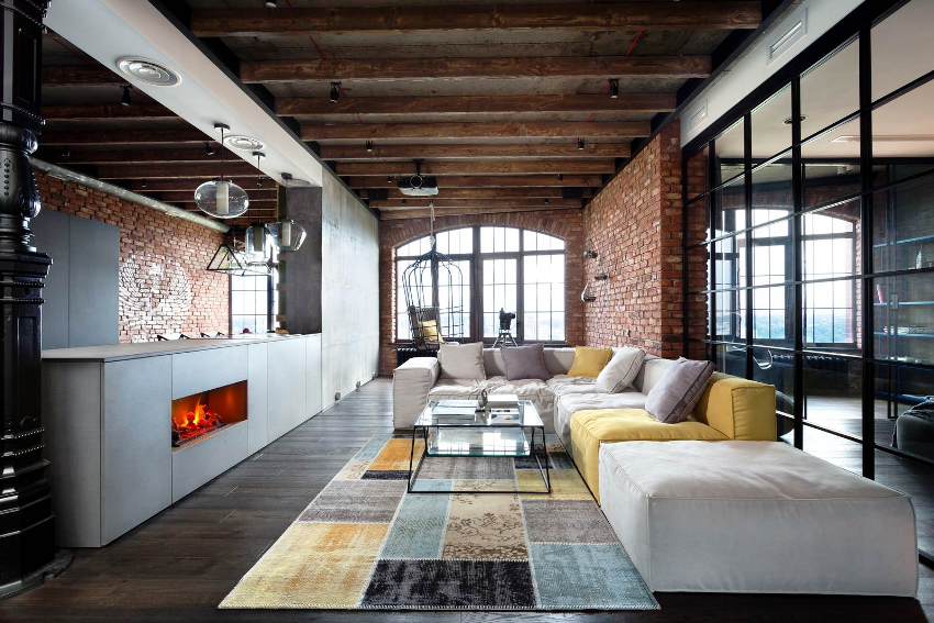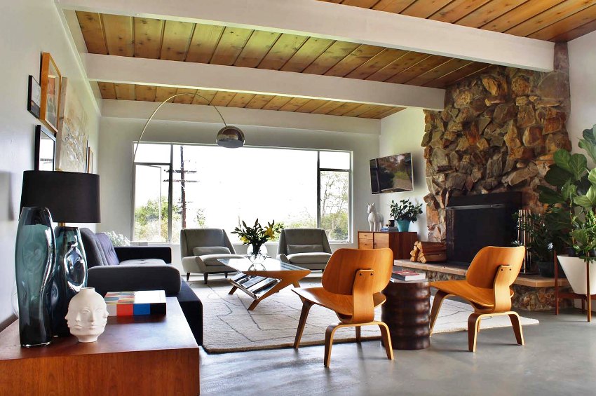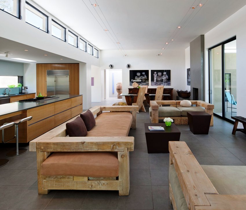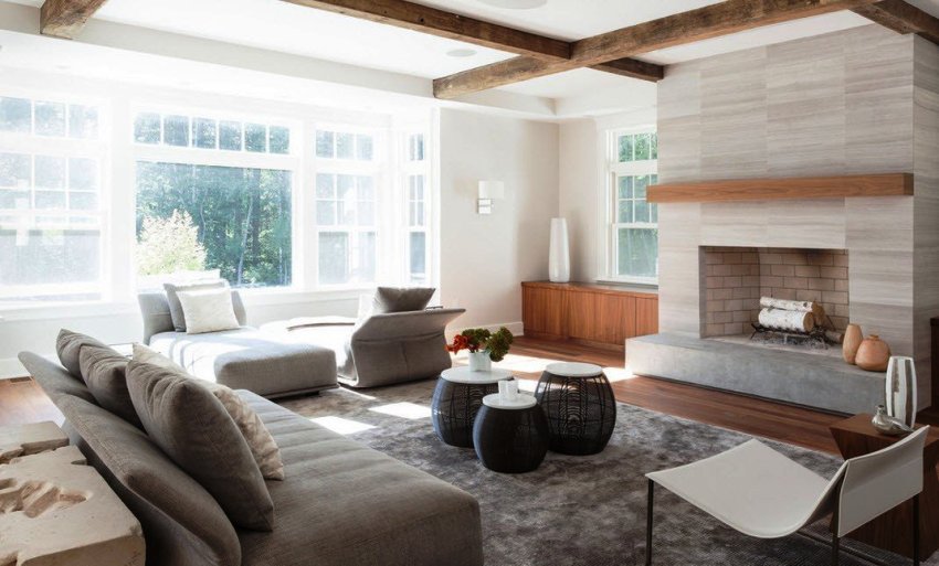 Ang paggamit ng mga beamed ceilings sa isang modernong sala ay nagdudulot ng isang ugnay ng buhay sa bukid sa isang progresibong interior