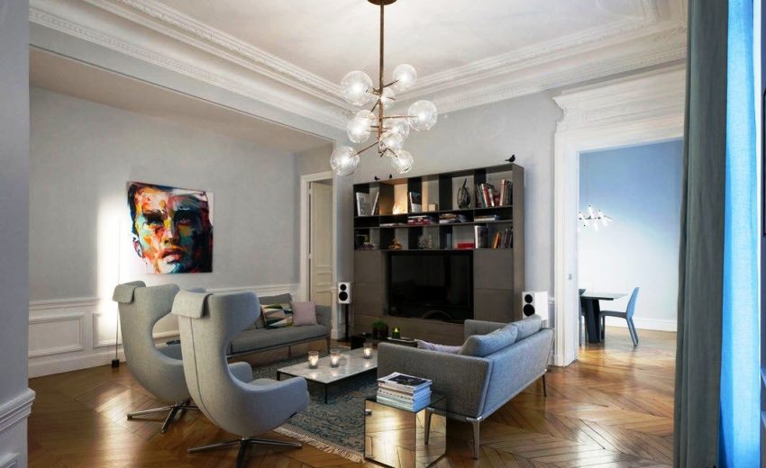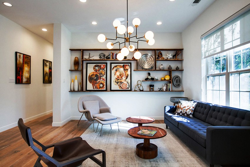 Para sa isang modernong sala, mahalaga na maayos na ayusin ang artipisyal na ilaw. Ang aktwal na solusyon ay ang pag-install ng isang kisame chandelier, na maaaring magkaroon ng anumang pagsasaayos. Kapag pumipili ng mga shade, ang kagustuhan ay ibinibigay sa mga produktong gawa sa transparent na baso.