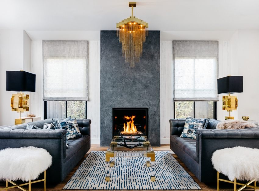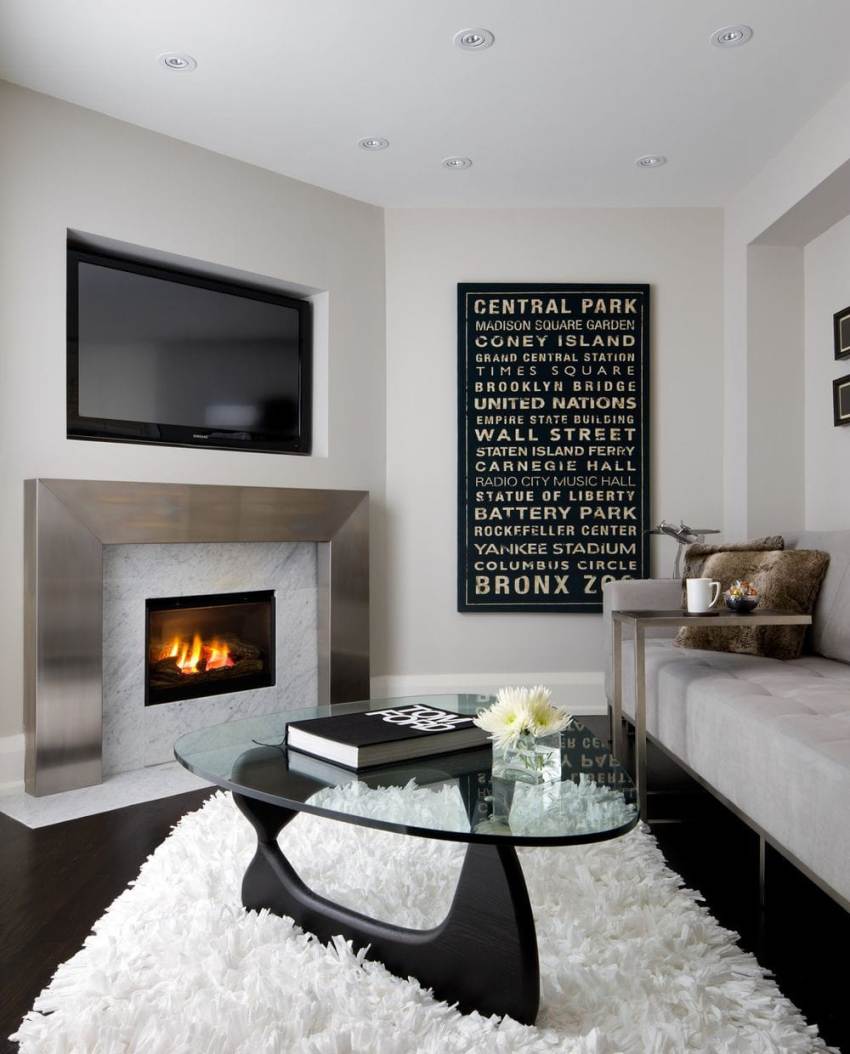 Kung ang isang kahabaan ng kisame ay naka-mount, maraming maliliit na mga spotlight ang magiging hitsura ng organiko. Kapag nag-oorganisa ng isang dalawang antas na istraktura ng drywall, maaari kang gumamit ng mga LED strip. Ang parehong pag-iilaw ay nauugnay para sa pag-iilaw ng isang fireplace sa isang modernong loob ng sala. Para sa lokal na pag-iilaw ng mga gumaganang lugar, dapat gamitin ang wall o table sconces na may metal na katawan. Sa kasong ito, angkop na gumamit ng mga matte lamp ng tradisyunal na silindro o bilog na hugis.