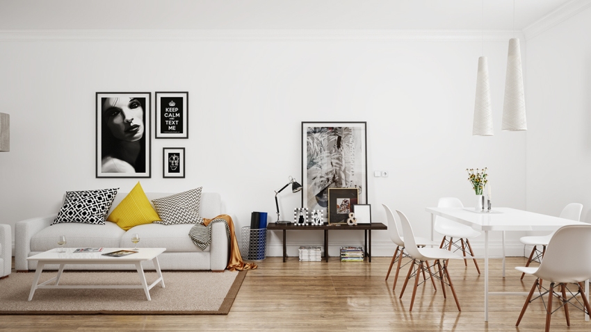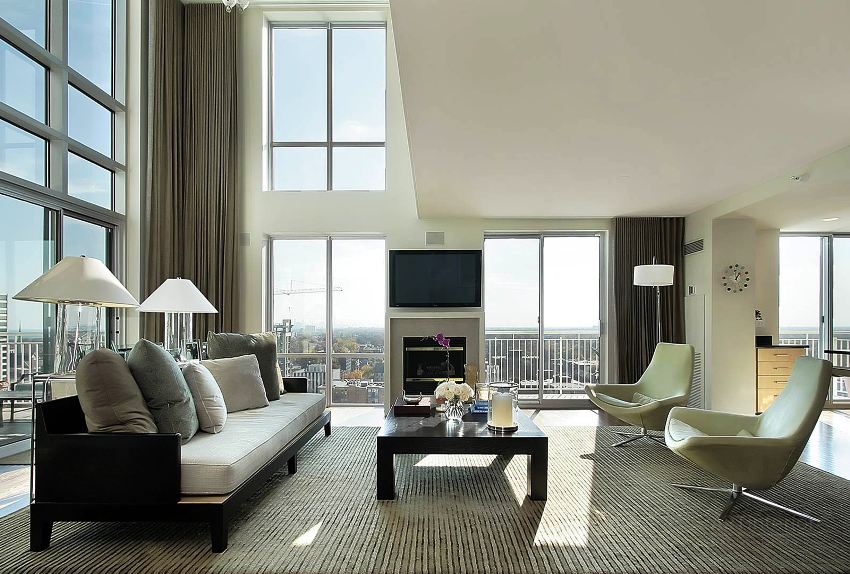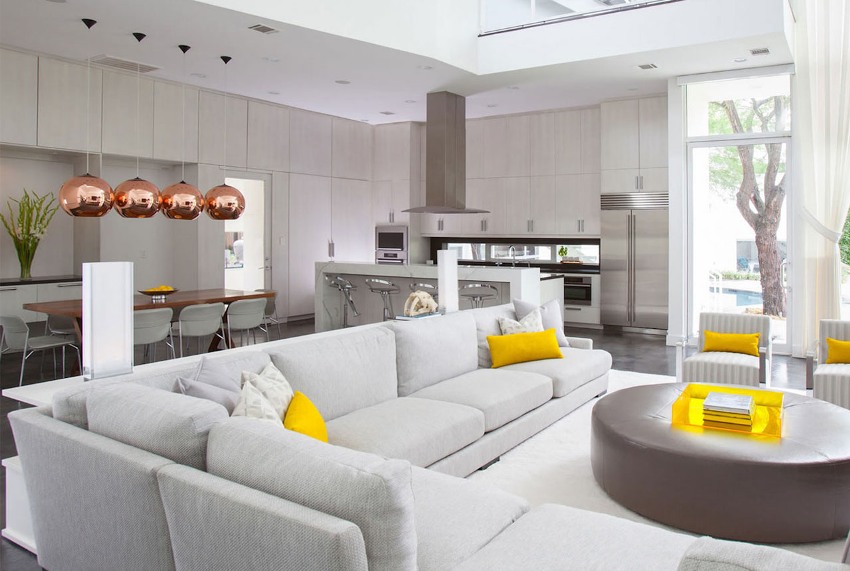 Sala sa isang modernong istilo - isang maluwang na silid na may isang maliit na hanay ng mga kasangkapan sa bahay