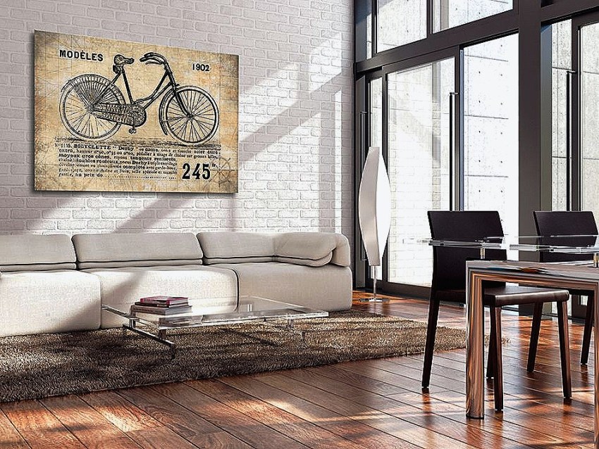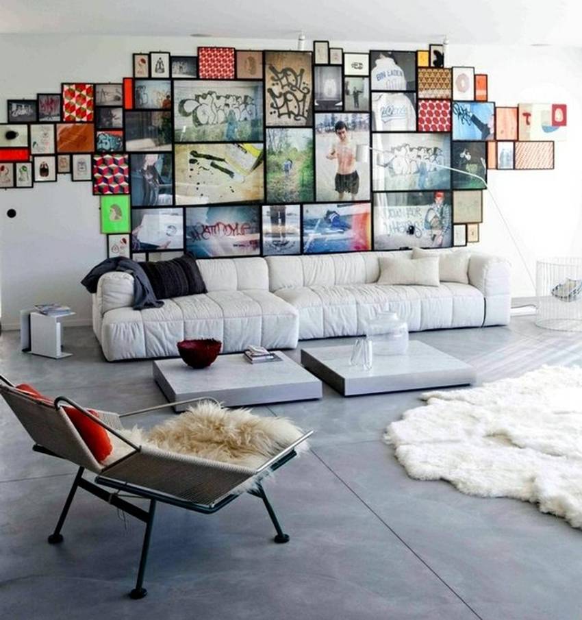 Ang mga abstract na kuwadro na gawa sa loob ng sala sa isang modernong istilo sa napakalaking mga frame ay magmumukhang kakaiba sa mga simpleng dingding. Ang pagpipinta ng watercolor o itim at puting graphics ay maaaring isang mahusay na pagpipilian.