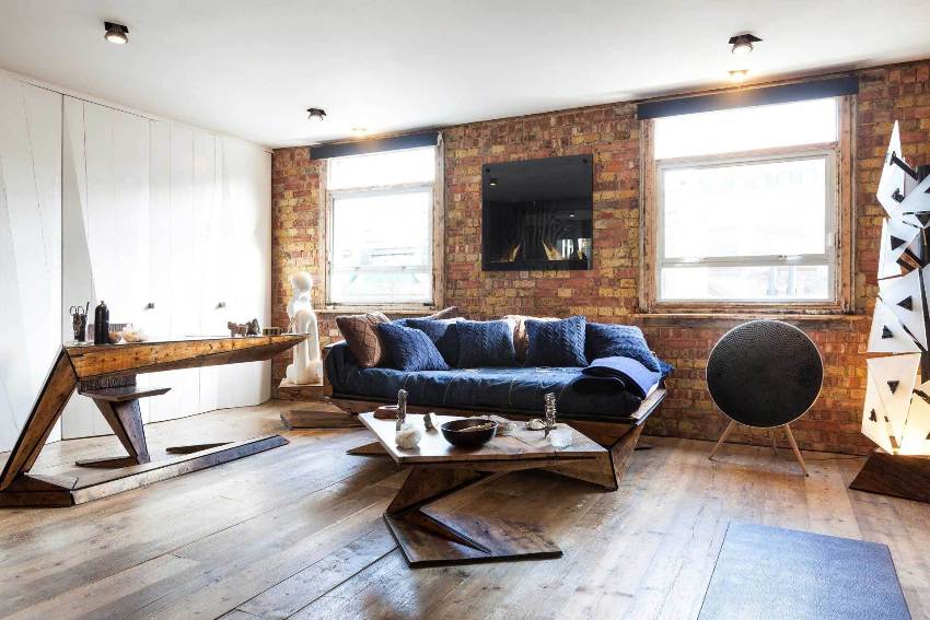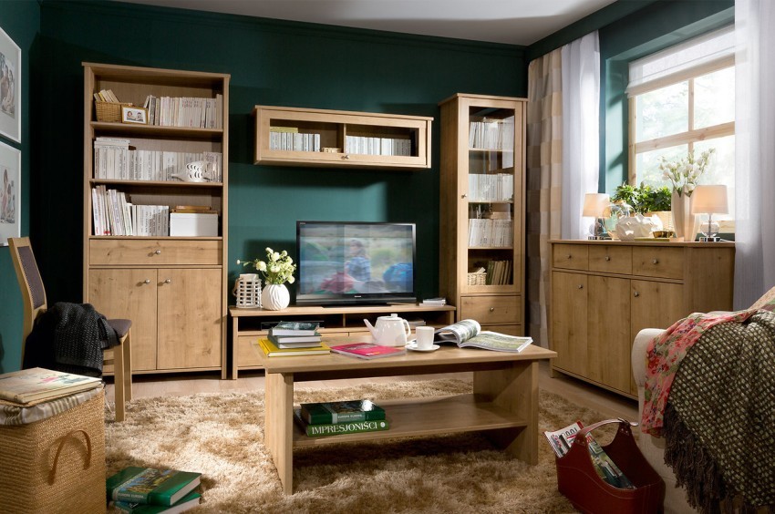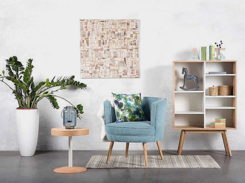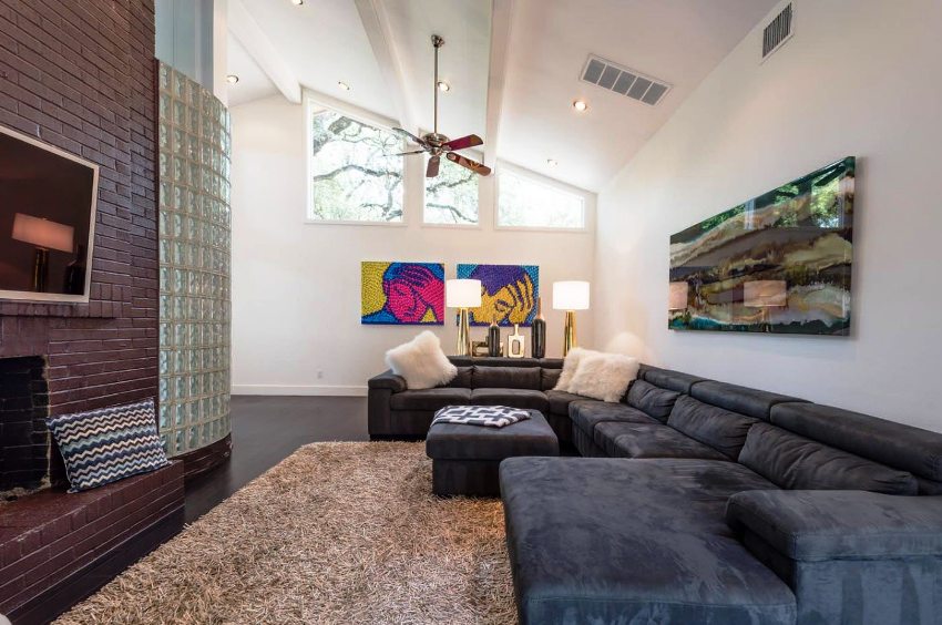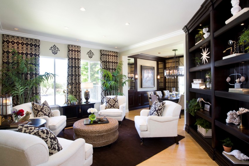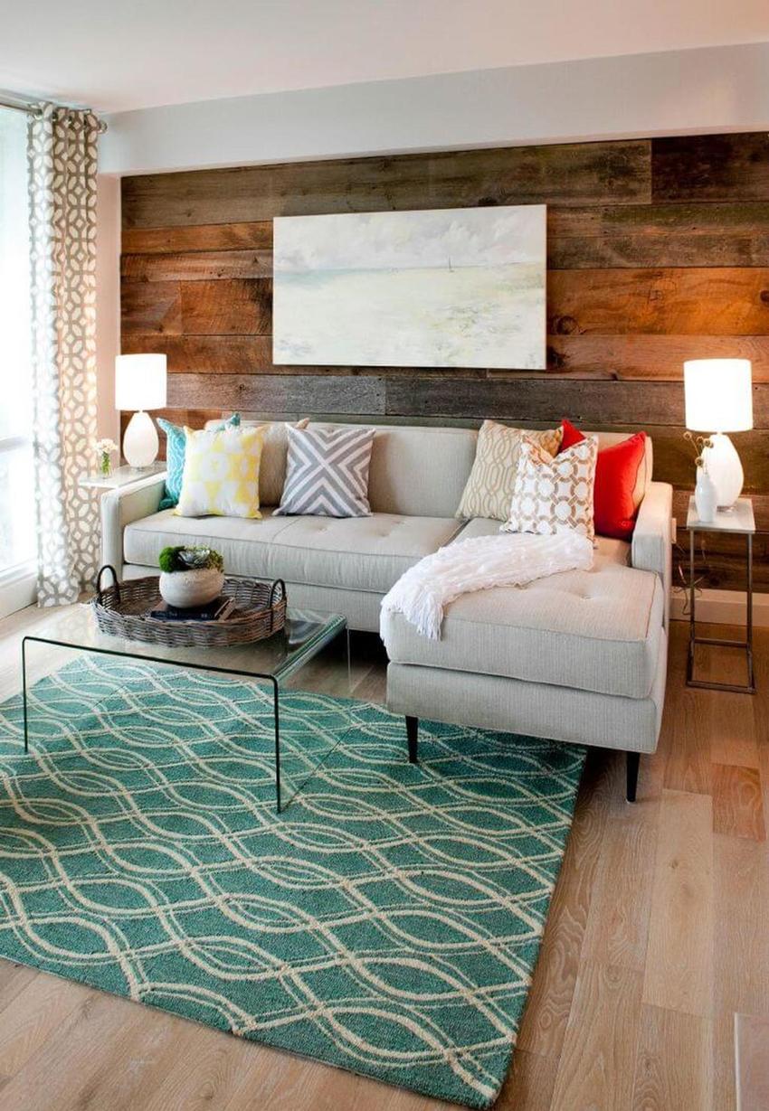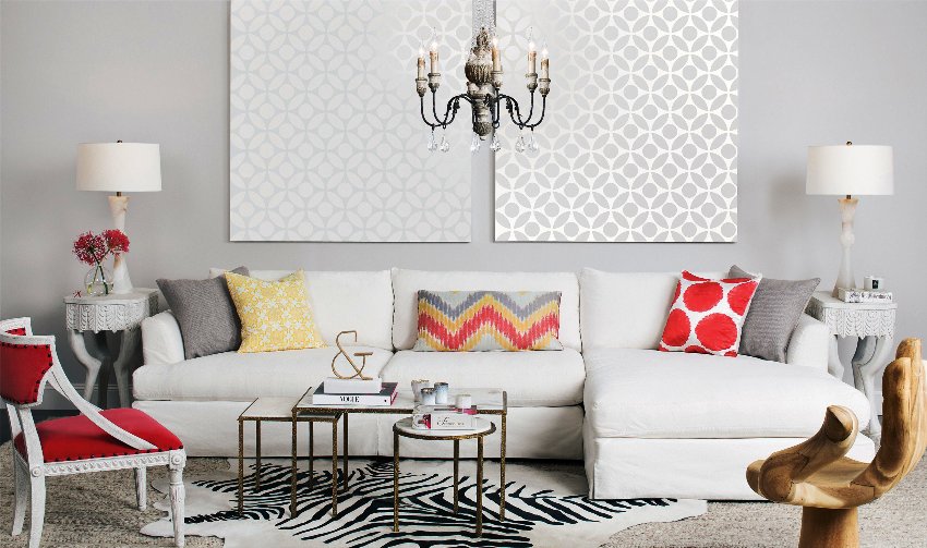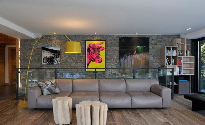 Sa loob ng isang modernong sala, ang mga indibidwal na ibabaw ay madalas na nakikilala gamit ang pagkakayari o pag-print.