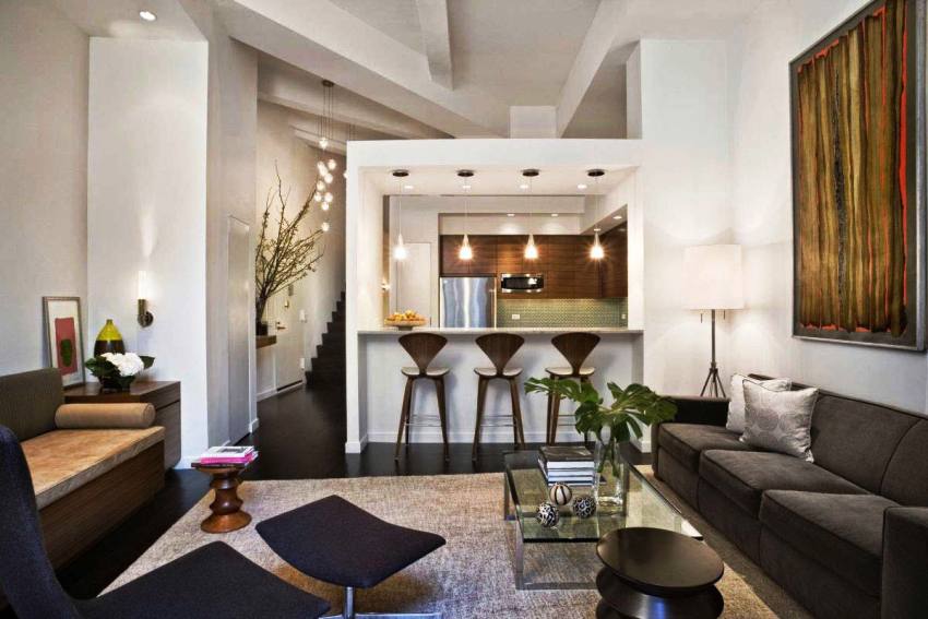Ang paglikha ng isang modernong panloob na sala ay nagbibigay-daan sa iyo upang mag-eksperimento sa iba't ibang mga materyales, kasangkapan at ilaw. Ang mga kagamitan ay dapat pigilan, ngunit pinong, simple, ngunit hindi wala ng pagka-orihinal.