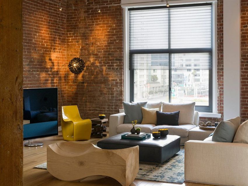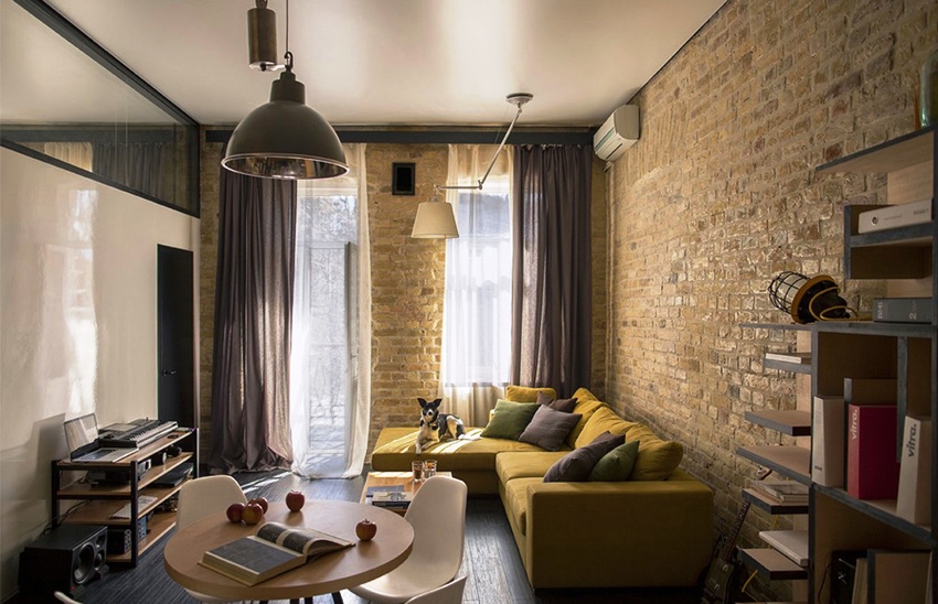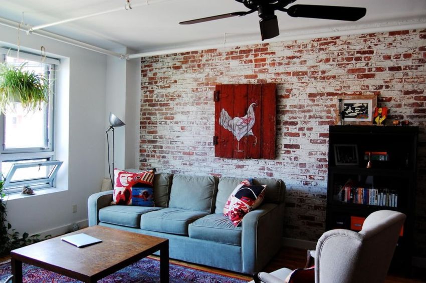 Ang isang mahusay na solusyon ay ang paggamit ng brickwork bilang isang accent ibabaw, na maaaring ipakita sa parehong natural na kulay ng brick at sa isang kulay. Ang unang pagpipilian ay nagsasangkot ng paglalapat ng isang antiseptiko at patong ng pagtanggal ng tubig sa ibabaw, at ang pangalawa - pagpipinta.