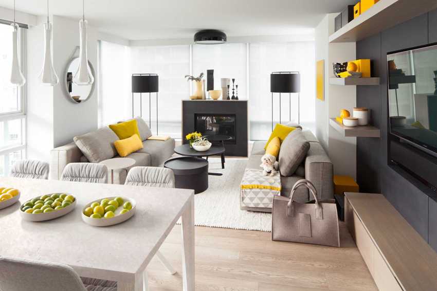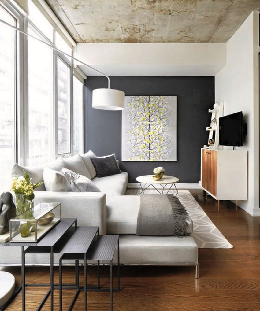Ang iba't ibang mga kakulay ng kulay-abo ay madalas na ginagamit upang palamutihan ang magagandang sala sa isang modernong istilo.
