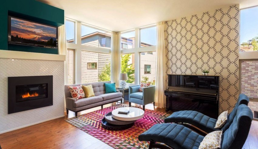 Ang isang modernong sala ay makikilala ng kaakit-akit, ngunit sa parehong oras pagka-orihinal, kung saan ang mga madilim na lilim ng fuchsia o burgundy ay pinagsama sa naka-mute na asul, malamig na kulay-abo o nahugasan na mga tono ng gatas.