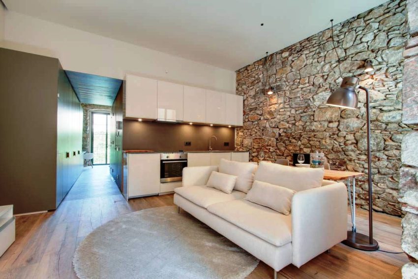 Ang mga pinturang monochromatic na pader ay isang magandang background para sa pagtatapos ng isa sa mga ibabaw o bahagi nito na may kakayahang umangkop natural na bato, na makikita sa mga high-tech na interior ng sala. Ang cladding na ito ay gumagana rin ng pandekorasyon na plaster. Ang malambot na pader ng impit sa likod ng sofa ay mukhang mahangin at kumpleto.