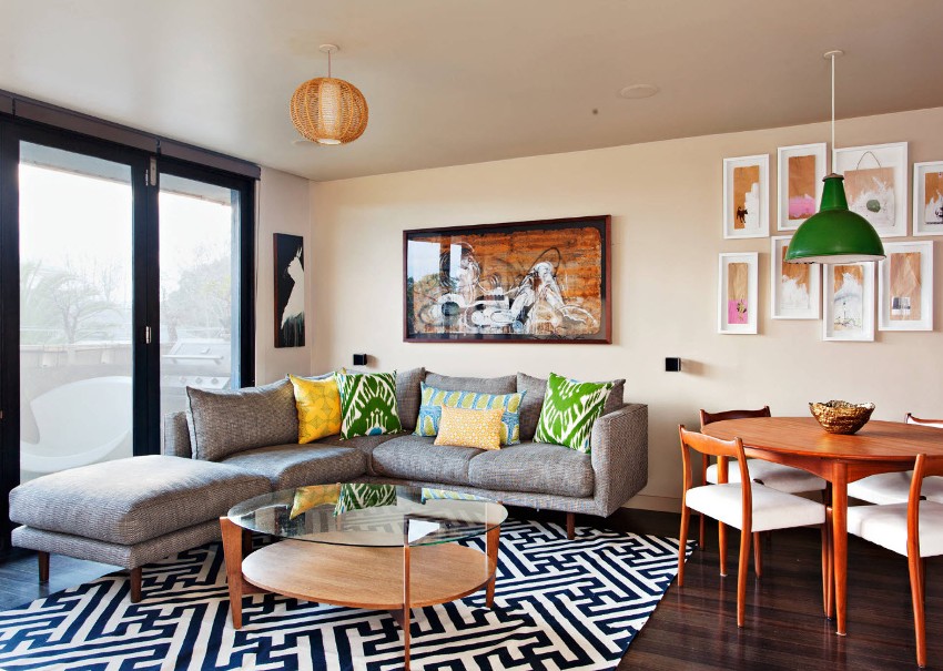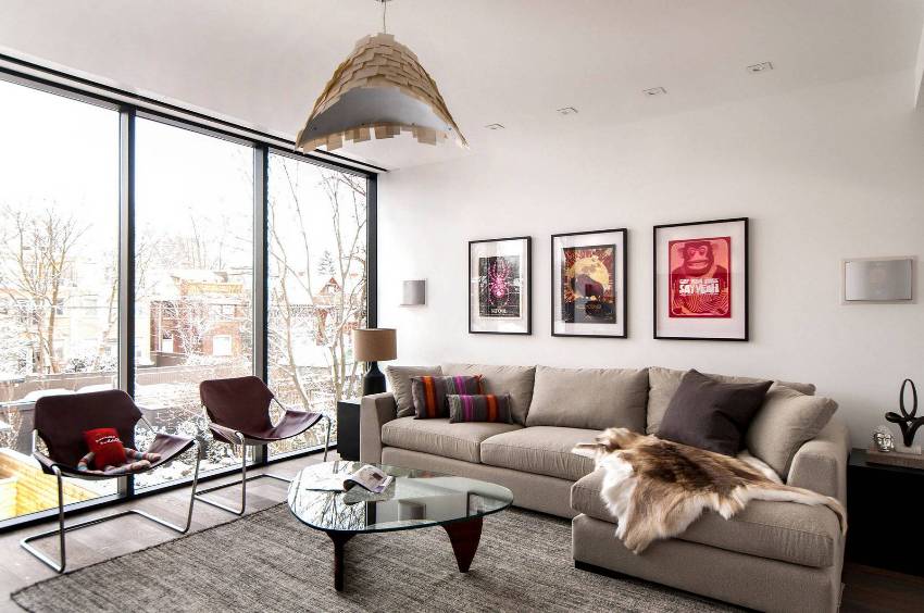 Ang modernong istilo ng sala ay isang orihinal na halo ng mga estilo tulad ng minimalism, modern, hi-tech, pop art at retro