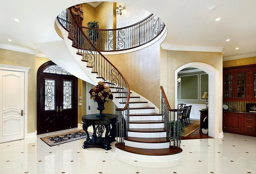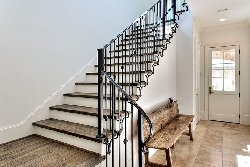 Kapag pumipili ng isang bakal na rehas na bakal para sa isang hagdanan sa isang bahay, kailangan mong ituon ang badyet. Ang pinaka-kahanga-hangang mga disenyo ng hitsura na may mga elemento ng masining na huwad. Ang mga pattern ng burloloy ay pinakaangkop sa mga interior na istilong antigong.