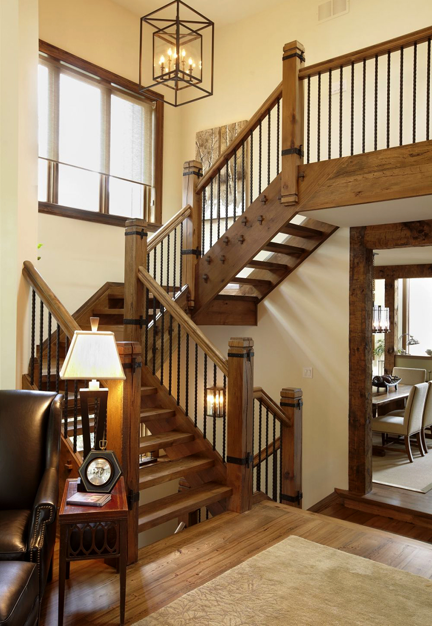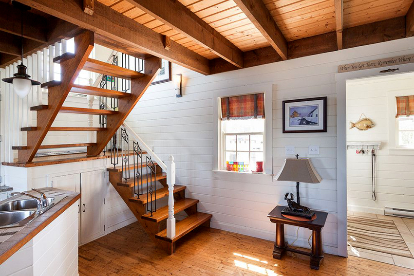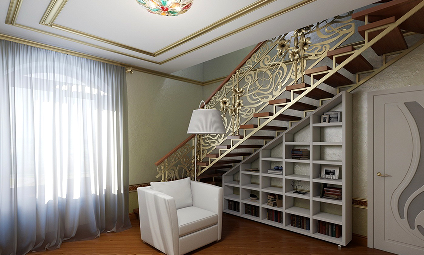 Nakatutulong na impormasyon! Ang hagdanan sa bahay ay maaaring katabi ng dingding. Sa ganitong sitwasyon, ang isang karaniwang bakod ay naka-install sa kabaligtaran, at ang mga huwad na handrail ay naayos sa dingding.