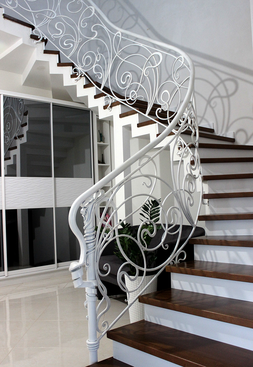 Ang pag-install ng mga spiral staircases ay nangangailangan ng isang espesyal na diskarte. Ang mga wraced iron stair ay mas mahal kaysa sa karaniwang mga pagpipilian (tuwid o beveled). Upang mapahaba ang buhay ng serbisyo ng isang metal ornament, inirerekumenda na mag-apply ng isang espesyal na patong ng polimer dito.