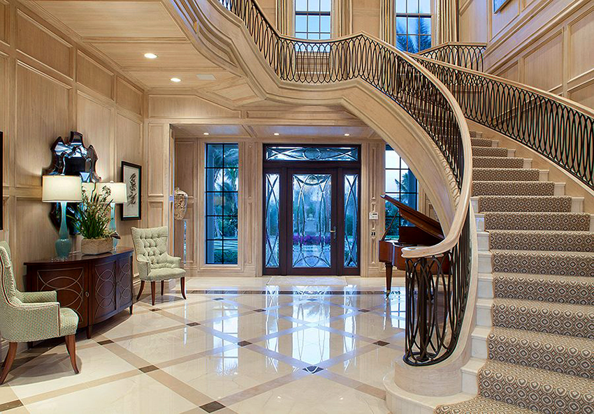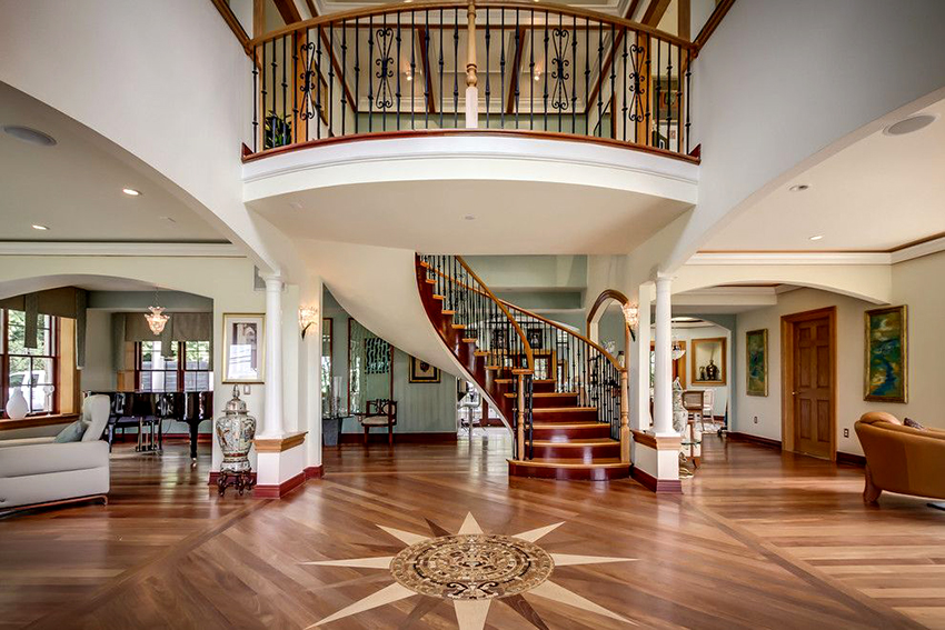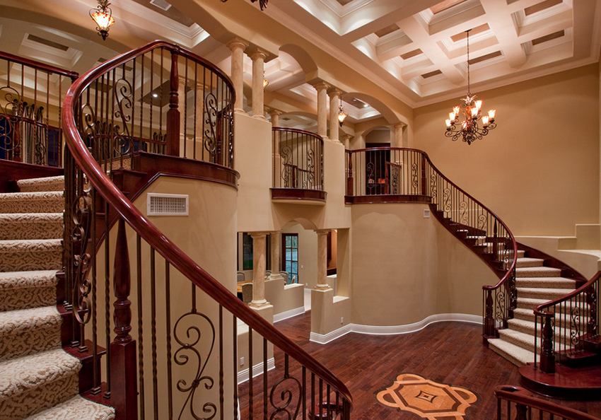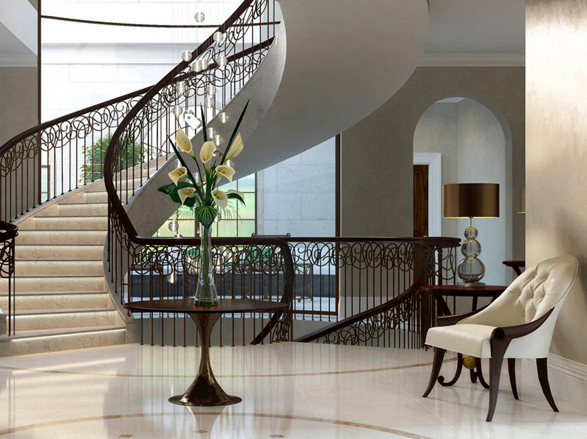 Ang malaking tirahan sa harap, na binubuo ng dalawang mga tier, ay may sapat na puwang, kaya't ito ay pinakaangkop para sa pag-install ng naturang hagdanan. Ang forging sa kasong ito ay magmukhang kahanga-hanga nang walang sobrang pagmamasid sa loob. Ang paglipad ng mga hagdan ay maaaring gawin sa hugis ng titik na "T" o magkaroon ng isang hugis-L na istraktura.