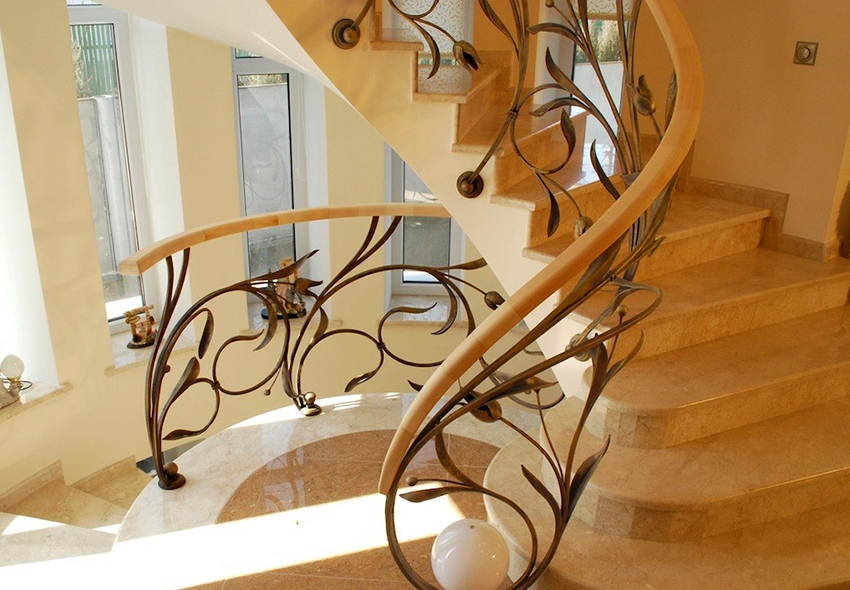 Tandaan! Ang mga burloloy na metal ay nagbabago ng anumang, kahit na ang pinakasimpleng, interior. Ang mga Handrail na may mga elemento ng huwad ay maaaring palamutihan ng isang regular na hagdanan na gawa sa kahoy, na gumagawamas pinong ito.