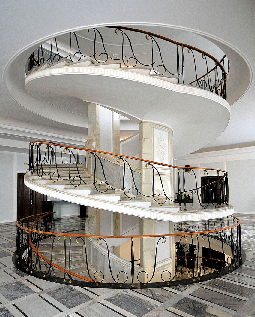 Tandaan! Ang mga railings na nilagyan ng mga elemento ng forging ay perpektong sinamahan ng spiral o dalawang-flight staircases. Ang saklaw ng pagpapatakbo ng naturang mga istraktura ay lubos na malawak, sapagkat maaari silang mai-install hindi lamang sa mga gusali ng tirahan, kundi pati na rin sa mga lugar ng tanggapan.