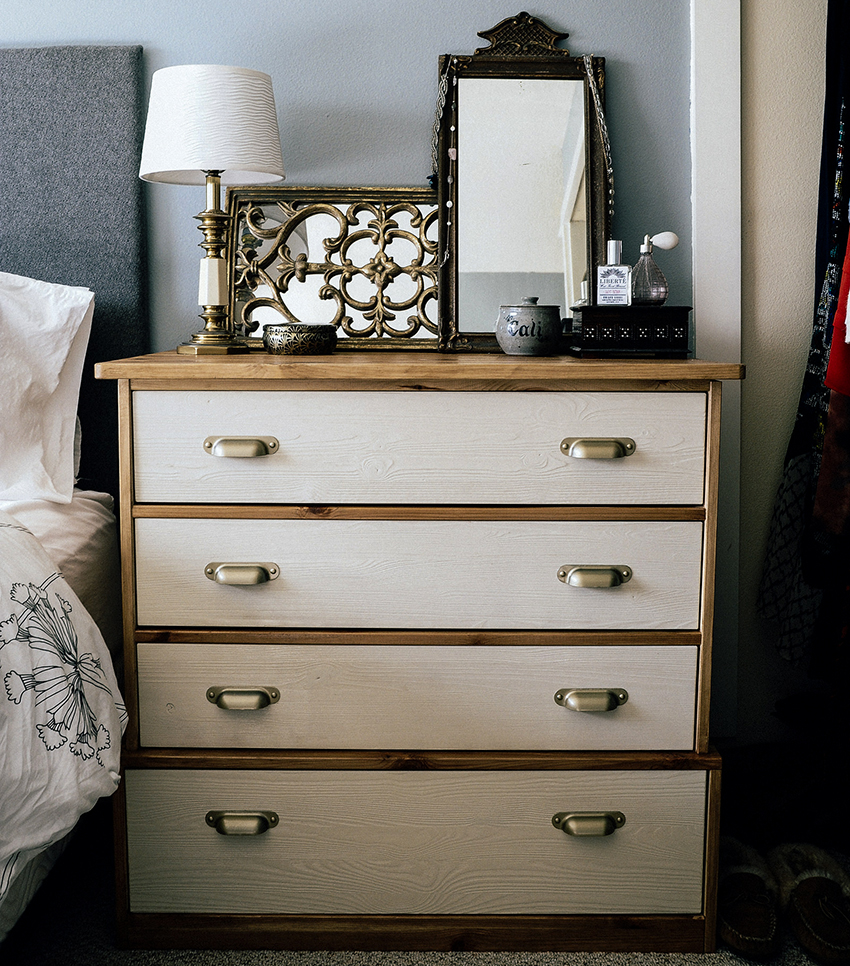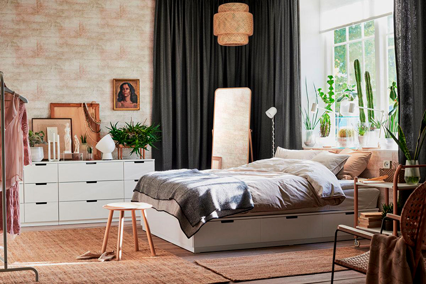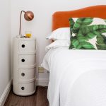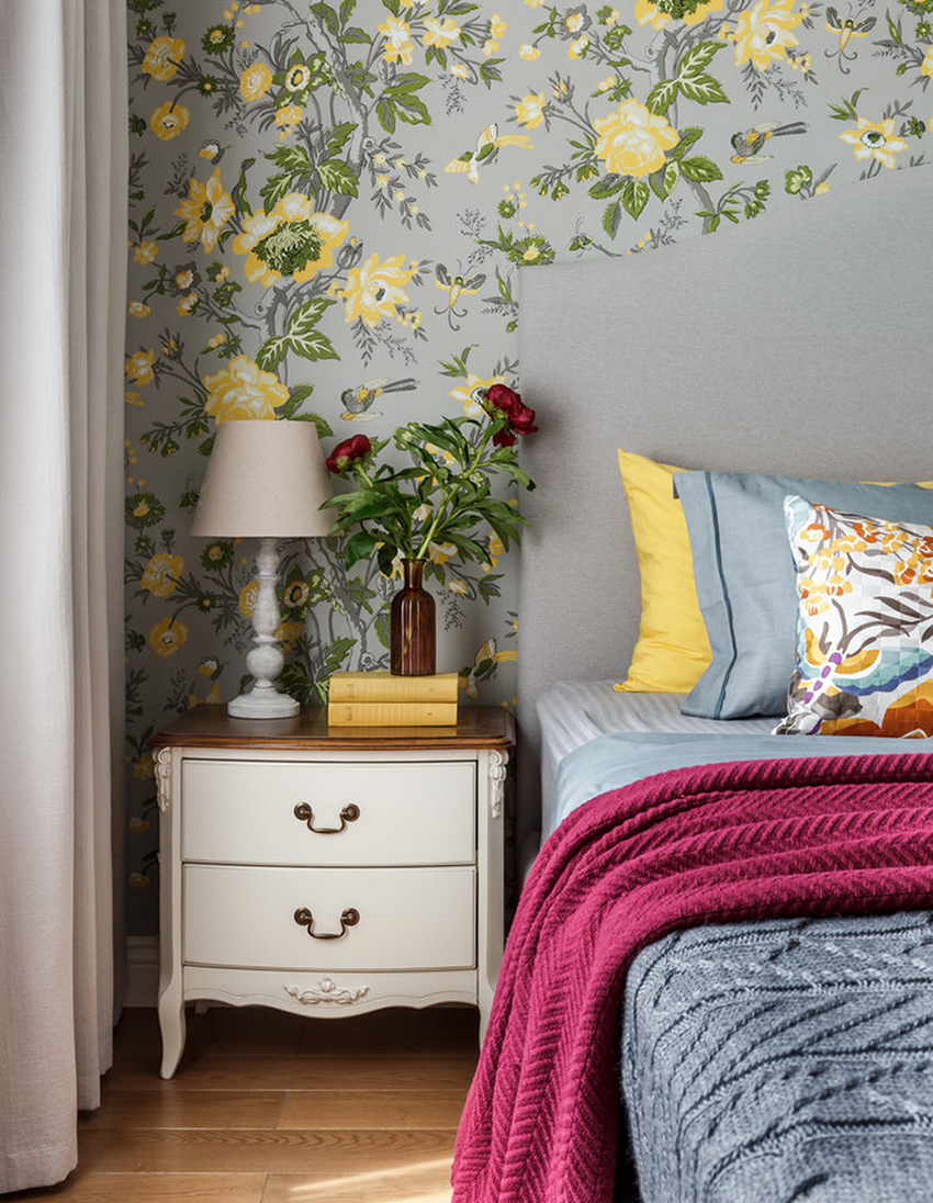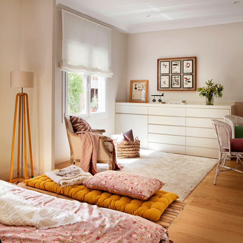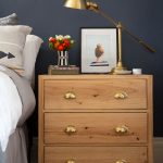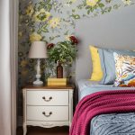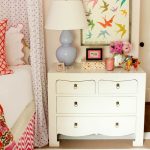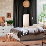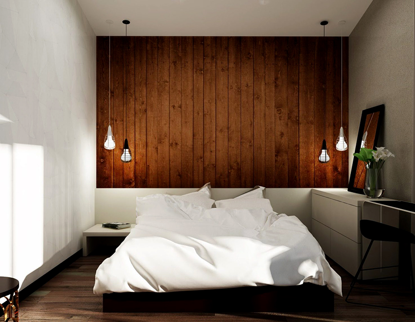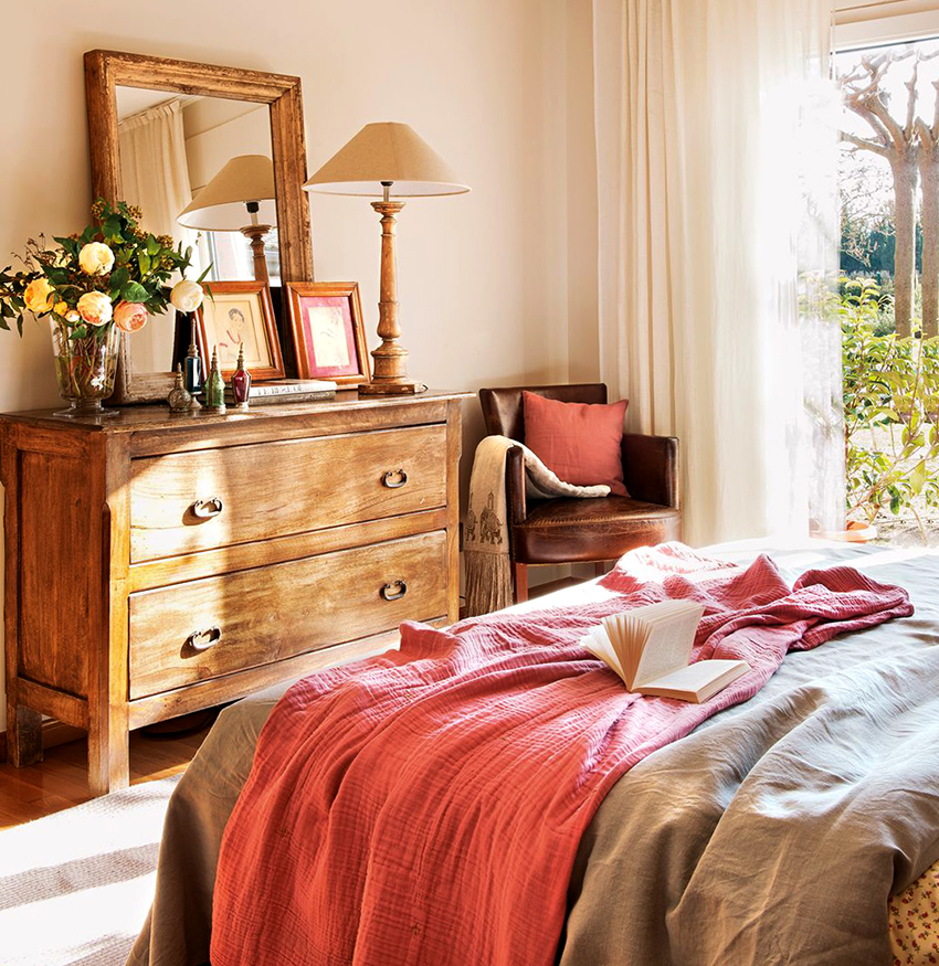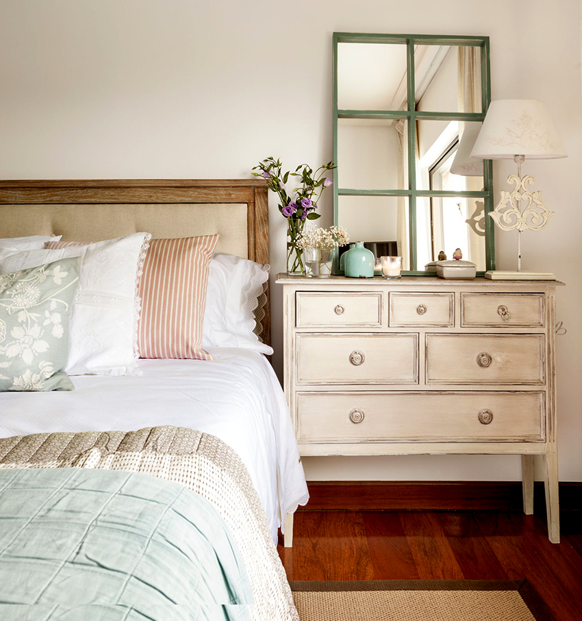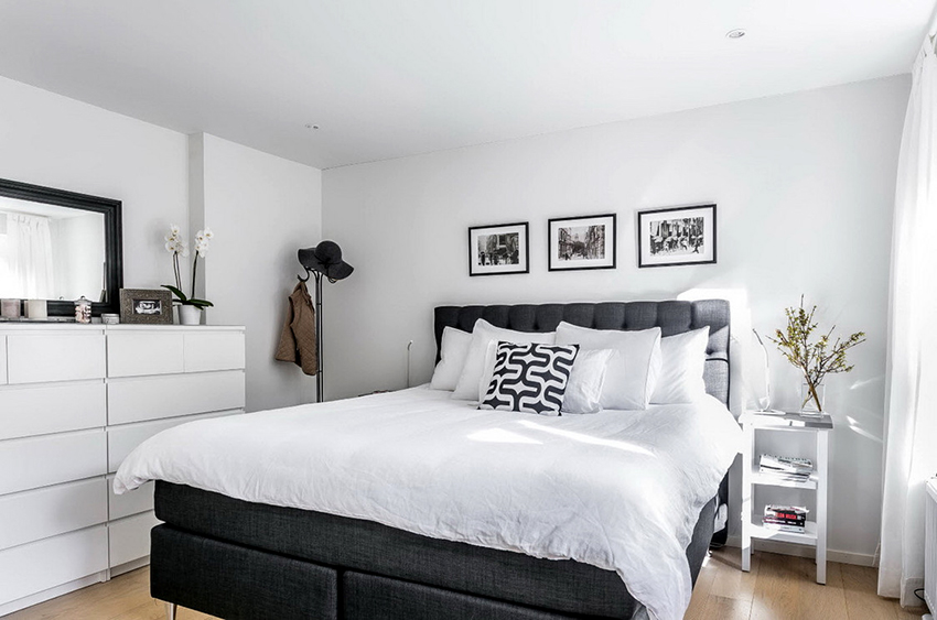 Ang isang maliit na dibdib ng drawer na malapit sa kama ay makakatulong na mapanatili ang lahat ng kailangan mo