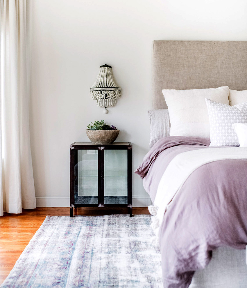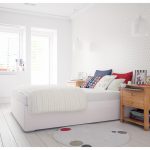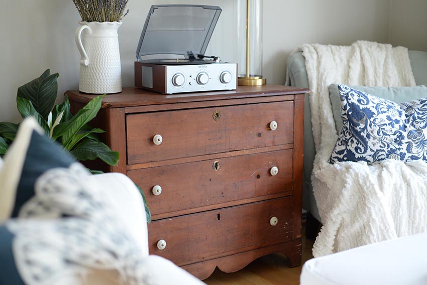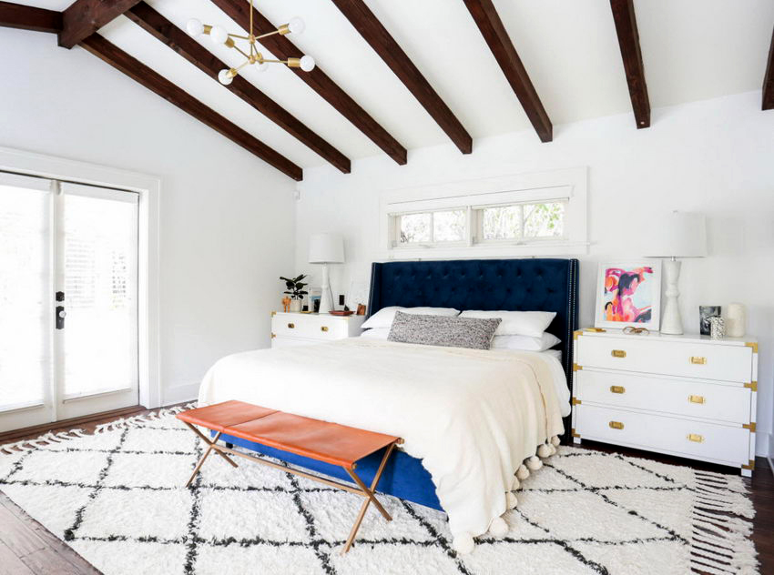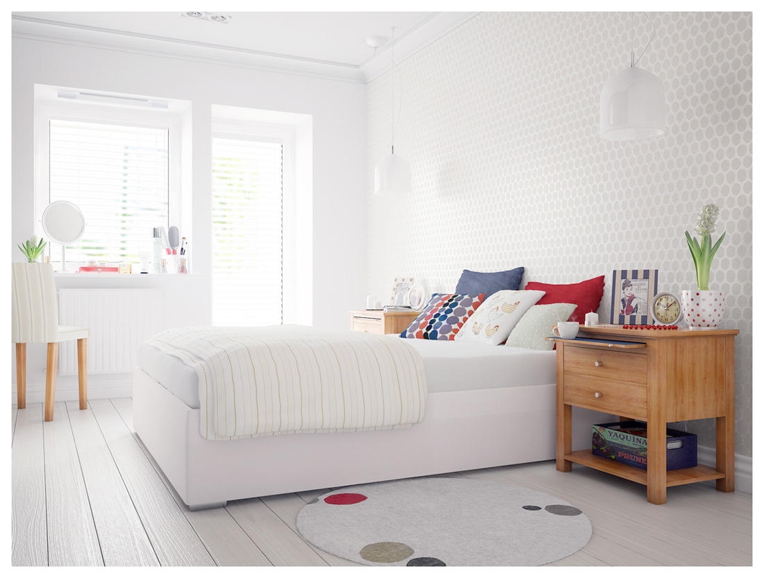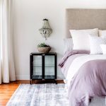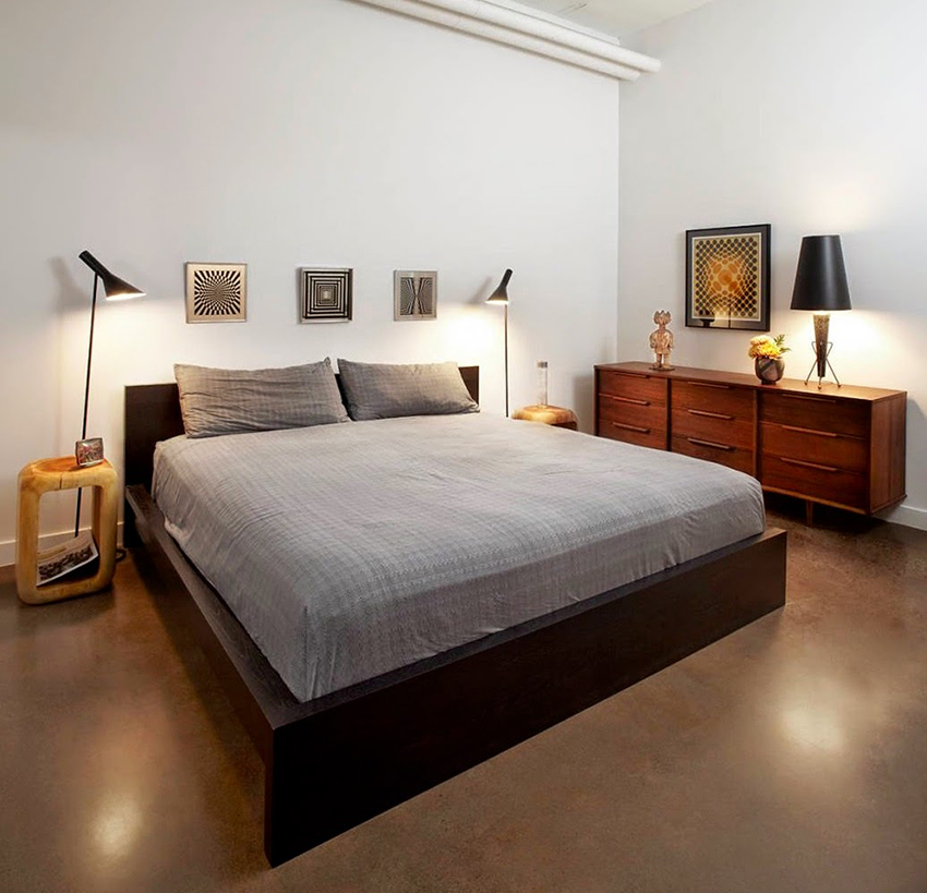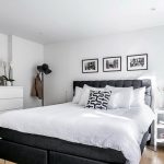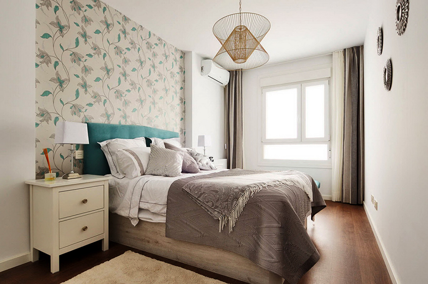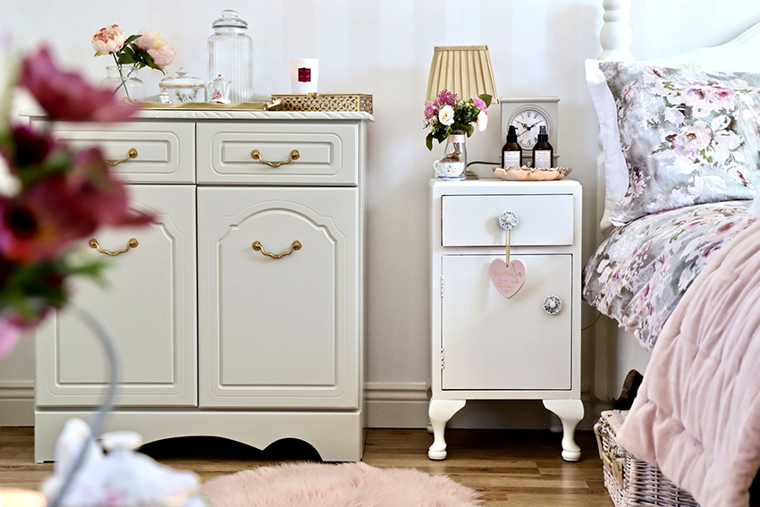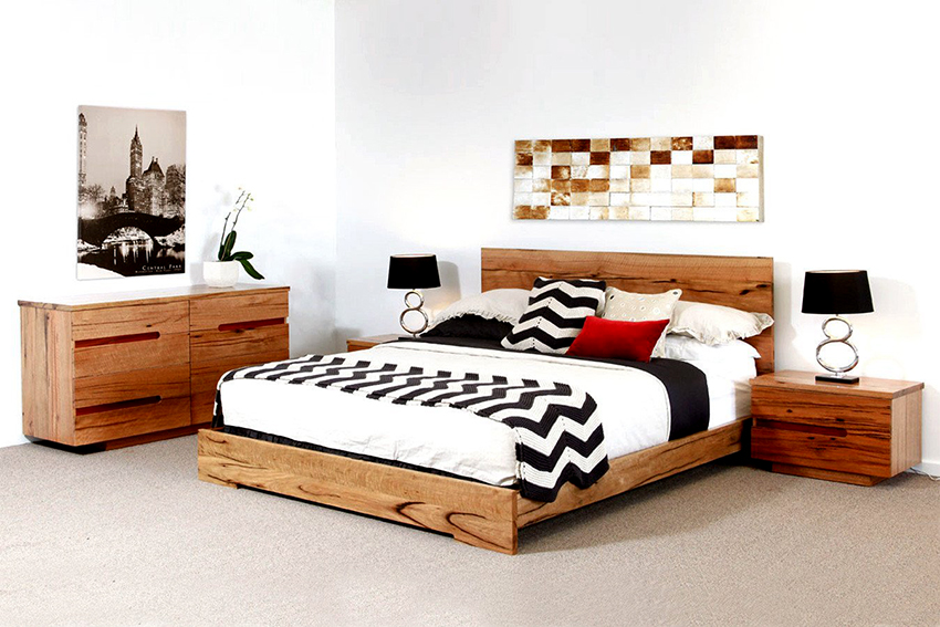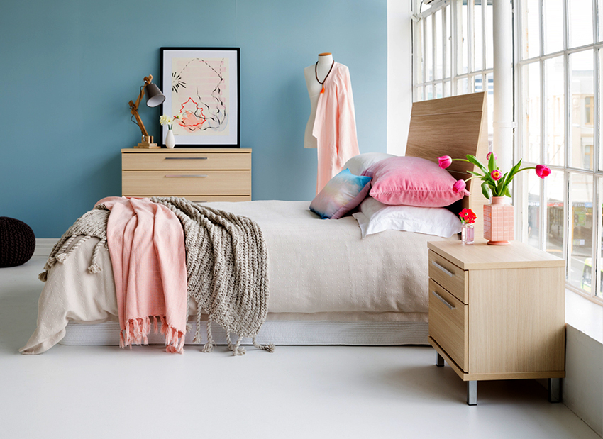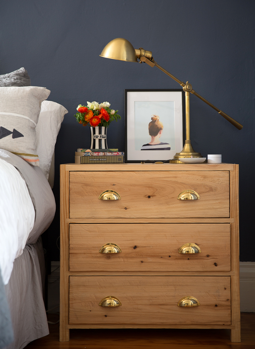 Ang isang maliit na dibdib ng drawer na malapit sa kama ay makakatulong na mapanatili ang lahat ng kailangan mo