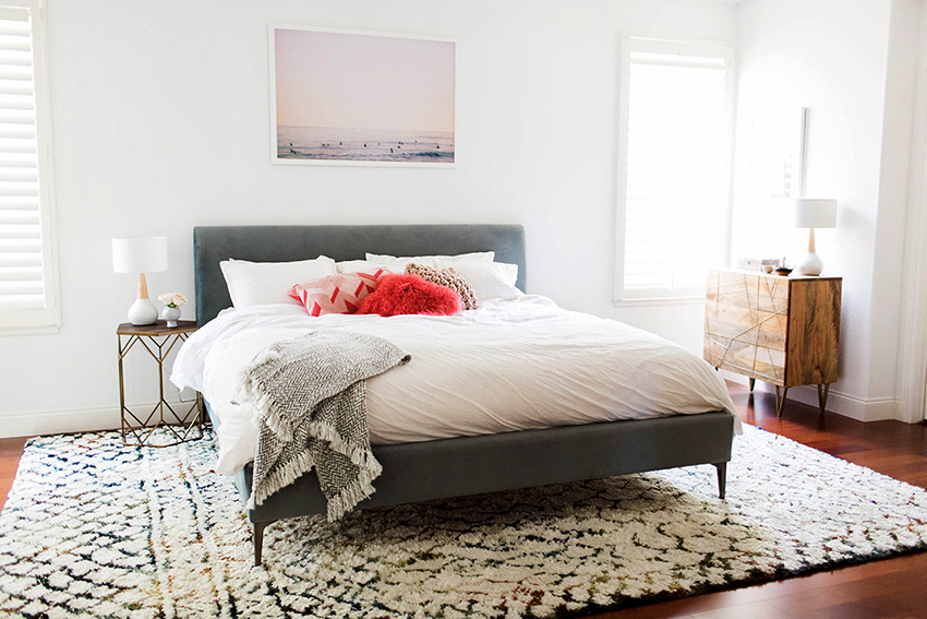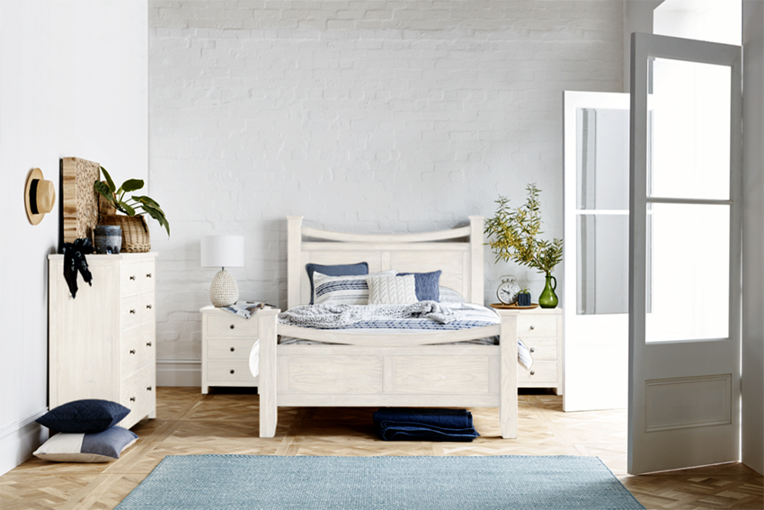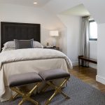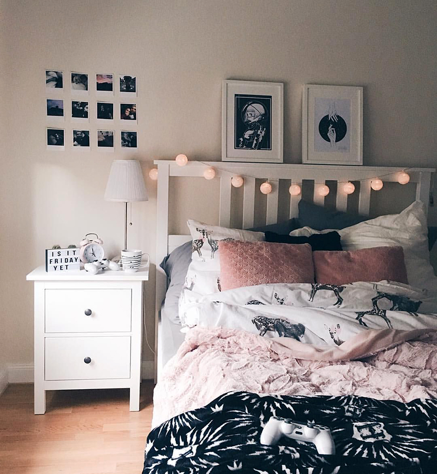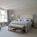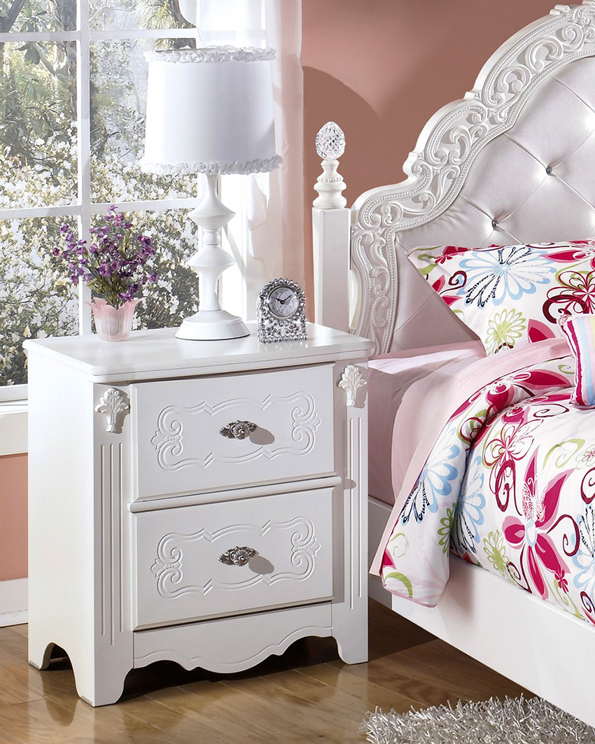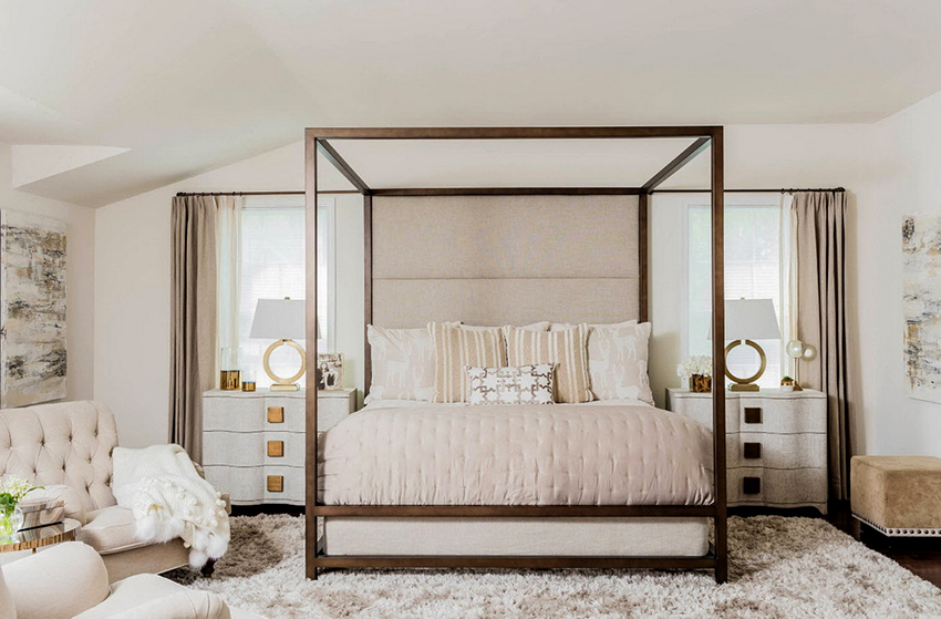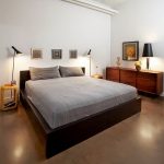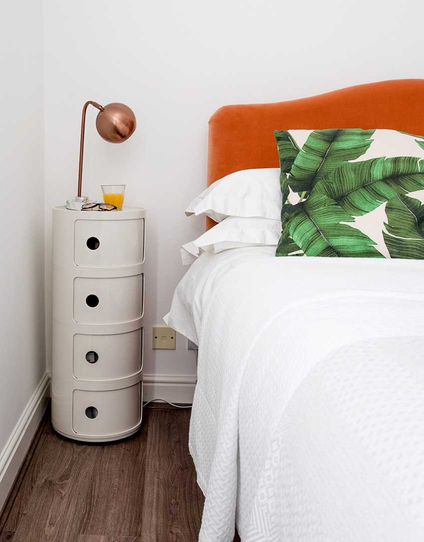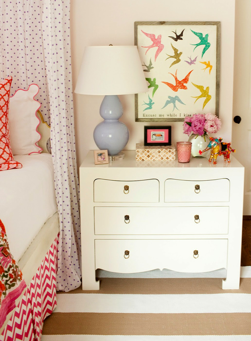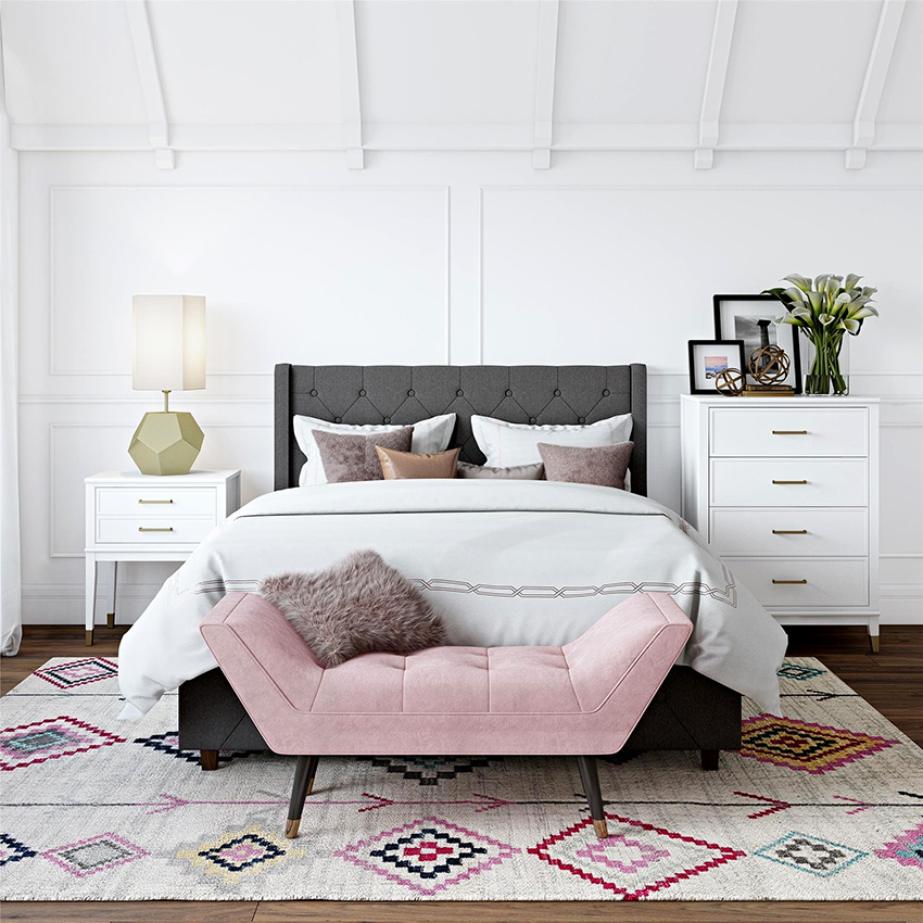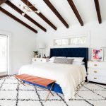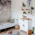 Ang isang maliit na dibdib ng drawer na malapit sa kama ay makakatulong na mapanatili ang lahat ng kailangan mo