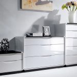 Ang istilong high-tech ay malapit sa minimalism. Maaari itong maging isang dibdib ng mga drawer na nilagyan ng mga bahagi ng metal at salamin, pati na rin mga modernong kabit, partikular ang Push to open system, na nagsasangkot ng pagbubukas sa pamamagitan lamang ng pagpindot gamit ang palad o paa.
