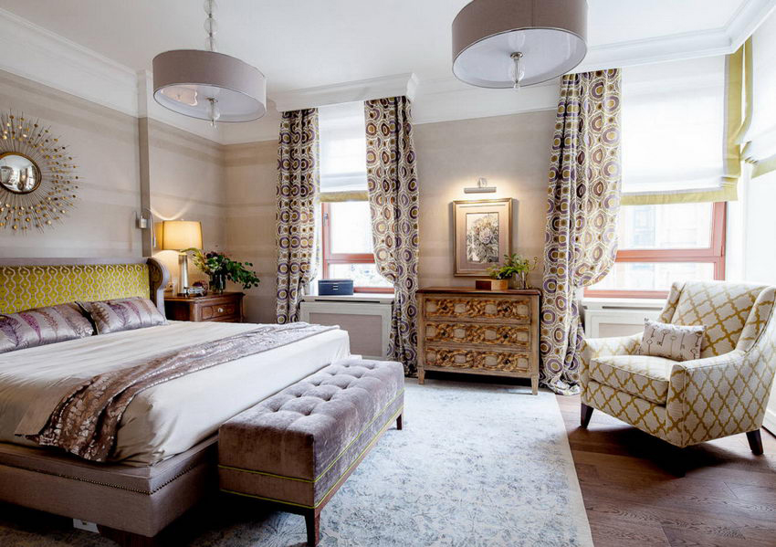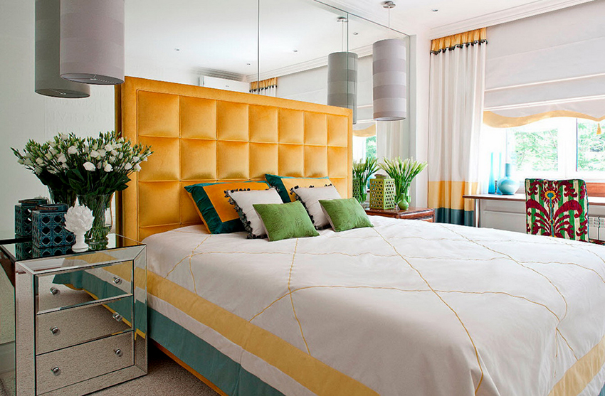 ang salamin sa silid-tulugan sa itaas ng dibdib ng mga drawer, pati na rin ang maraming iba't ibang mga pandekorasyon na elemento sa anyo ng larawang inukit o pagpipinta, ay nag-aambag sa magandang disenyo ng silid, na nagbibigay ng pagiging sopistikado at isang marangyang hitsura sa interior.