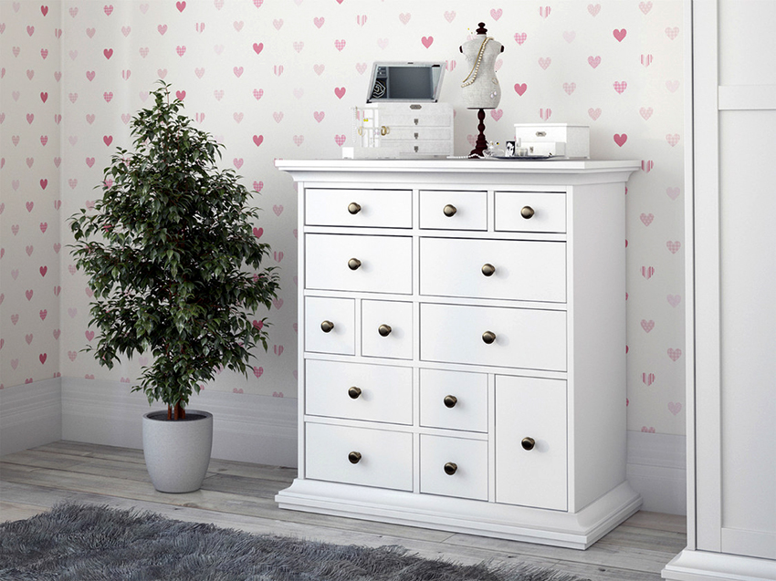 Ang dibdib ng mga drawer ay isang hiwalay na uri ng mga kasangkapan sa bahay na ito. Dinisenyo ito upang mag-imbak ng iba't ibang maliliit na bagay sa anyo ng mga kagamitan sa pagsulat, mga laruan o kosmetiko. Ang mga subspecie ng pagpipiliang ito ay isang dresser-bureau, na naglalaman ng isang malaking bilang ng mga maliliit na drawer kung saan nakaimbak ng mga alahas, titik, dokumento at iba pang mahahalagang bagay.