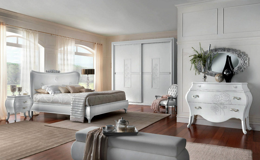 Ang isang puting dresser sa kwarto ay ang pinakapopular na pagpipilian. Maaari itong magkaroon ng iba't ibang uri ng mga shade - mula sa snow-white hanggang sa gatas at garing, na perpekto na pinaghalo sa iba pang mga kulay, habang binibigyan ang kasiyahan ng pagkakaisa at kagandahan. Ang isang aparador sa isang puting silid-tulugan ay mukhang lalong maluho.