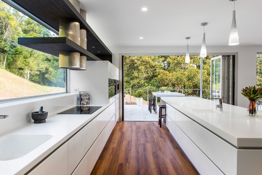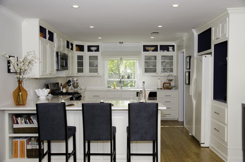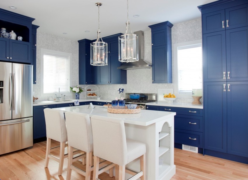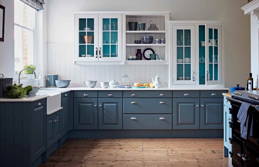 Karaniwang mayroong dalawang bahagi ang mga aparador sa kusina - sa tuktok (na may bukas na mga istante) at sa ibaba (na may mga pintuang bulag)