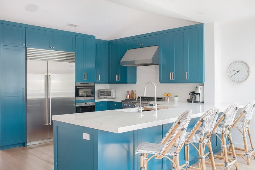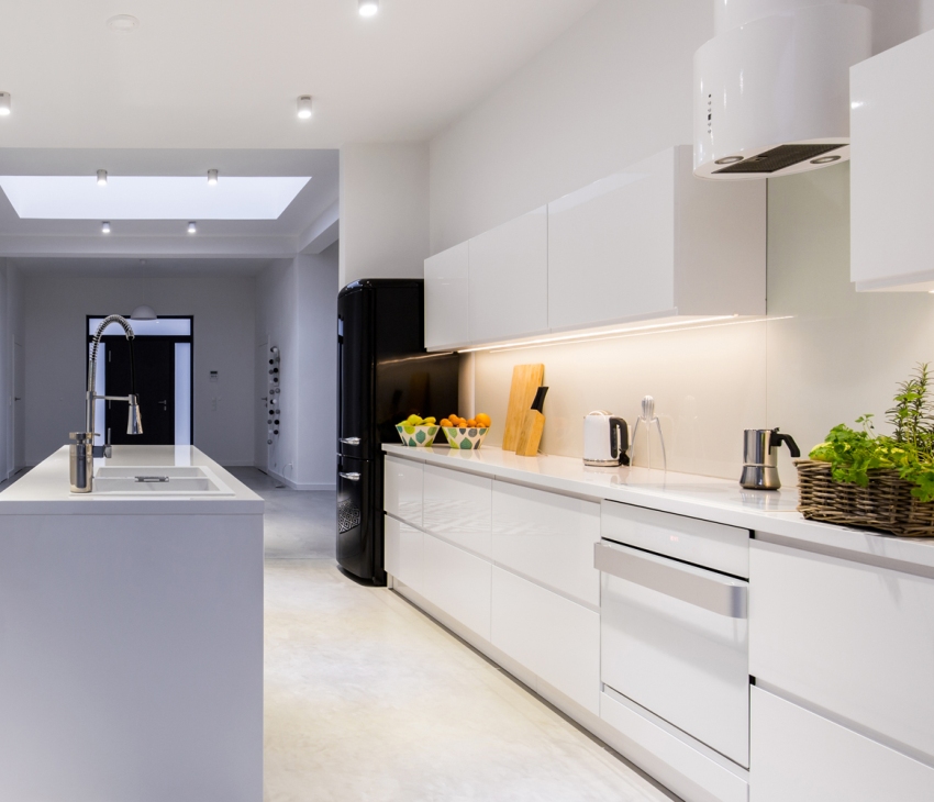 Para sa isang kusina sa isang minimalistic na istilo, ang mga bulag na saradong kabinet sa isang disenyo ng laconic ay angkop