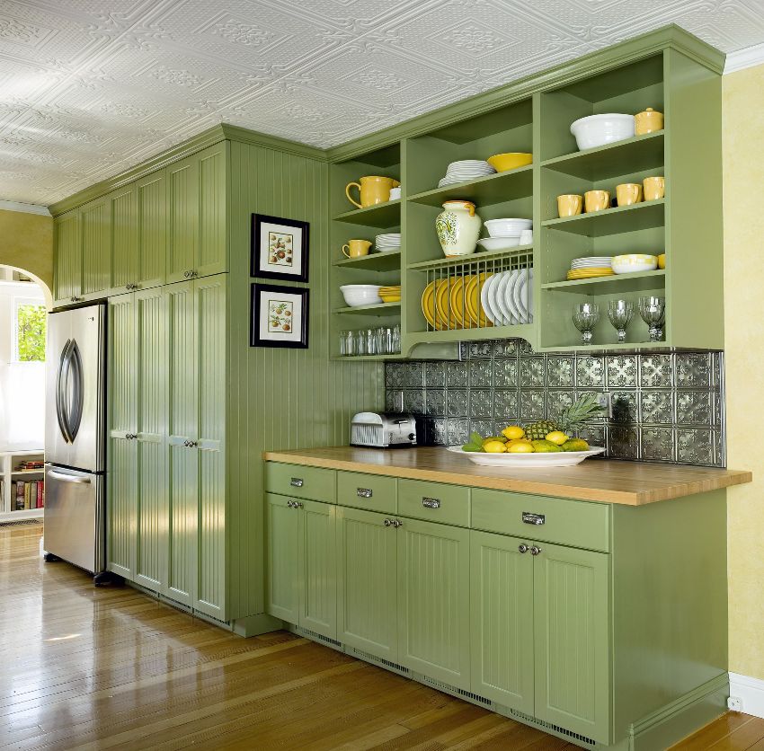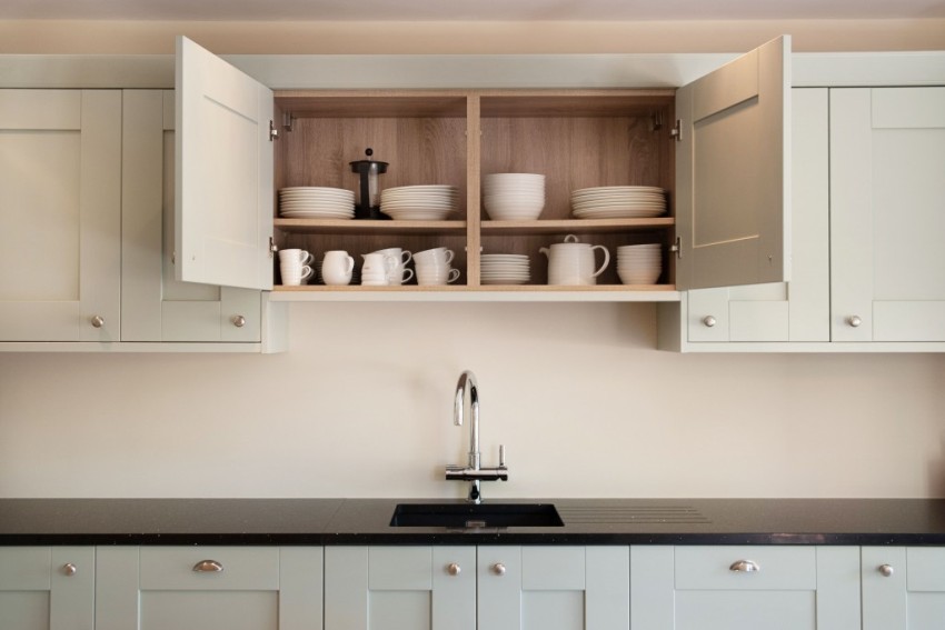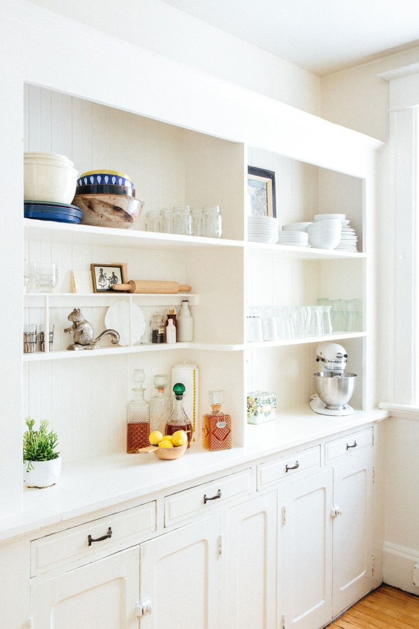 Ang mga kabinet sa ibaba, mga kabinet sa dingding at mga bukas na istante ay maaaring magamit upang mapaunlakan ang mga pinggan