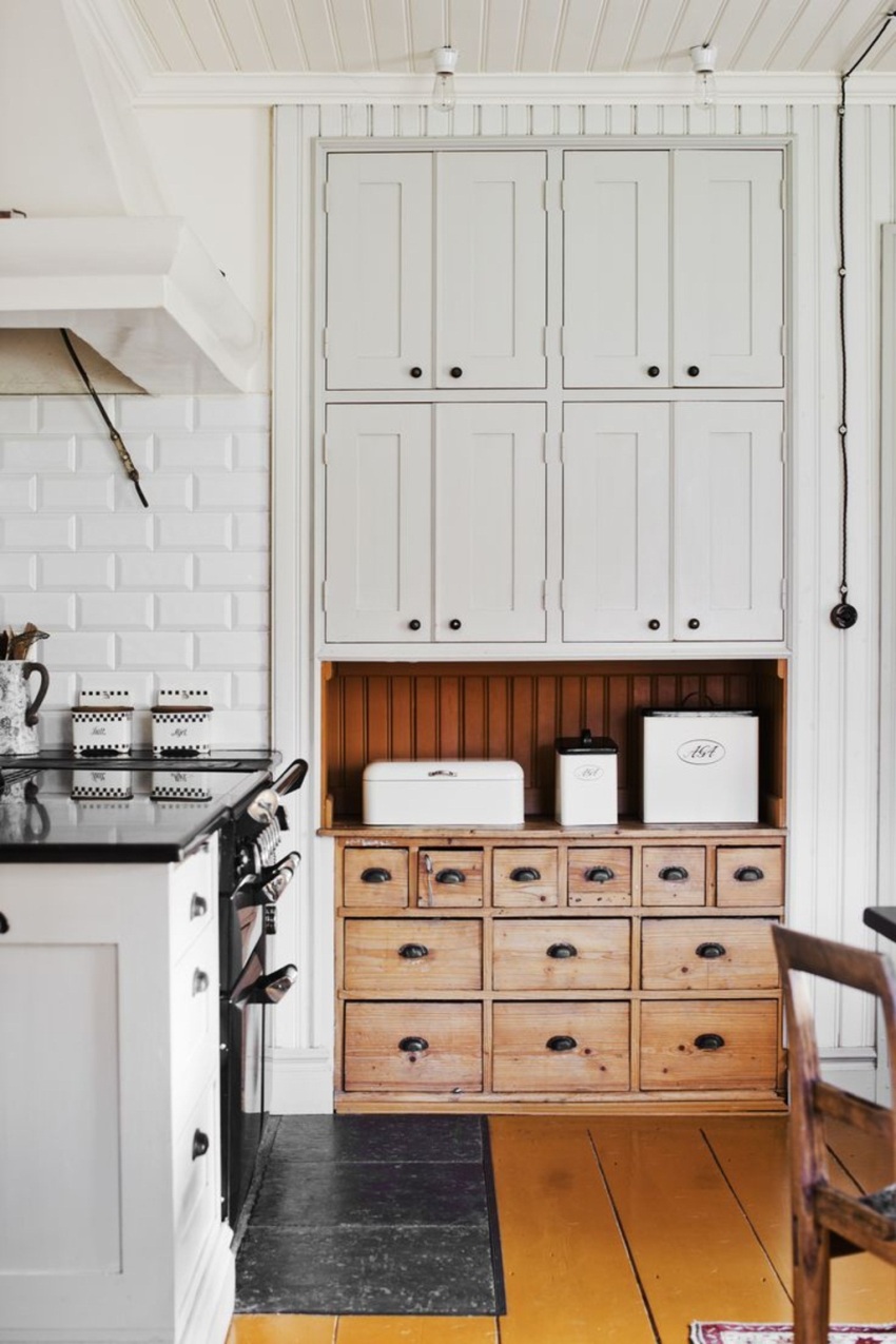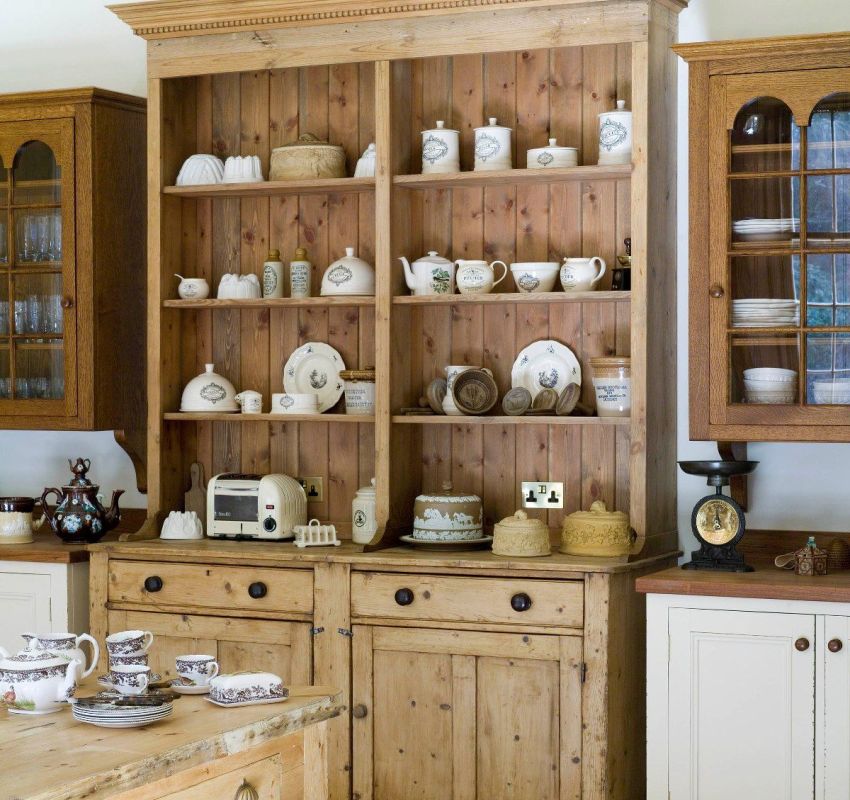 Para sa istilong pambansa at Provence kusina, ang mga sideboard ng isang simpleng hugis na gawa sa magaan na kahoy, na nilagyan ng mga bukas na uri ng drawer at istante, ay mas katanggap-tanggap. Ang highlight ng mga sideboard na ito ay isinusuot o artipisyal na may edad na mga ibabaw, nilagyan ng mga metal fittings.