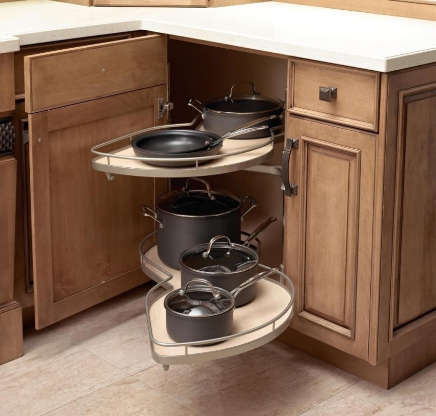 Ang carousel sa kusina ay isang istante na umiikot sa isang bilog, na nagbibigay-daan sa mahusay na paggamit ng puwang sa mga sulok na kabinet. Ang disenyo na ito ay nagsasangkot ng paglalagay ng kahit na malaking bagay tulad ng kaldero at pans.