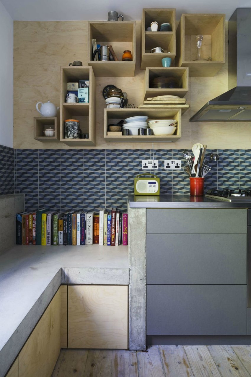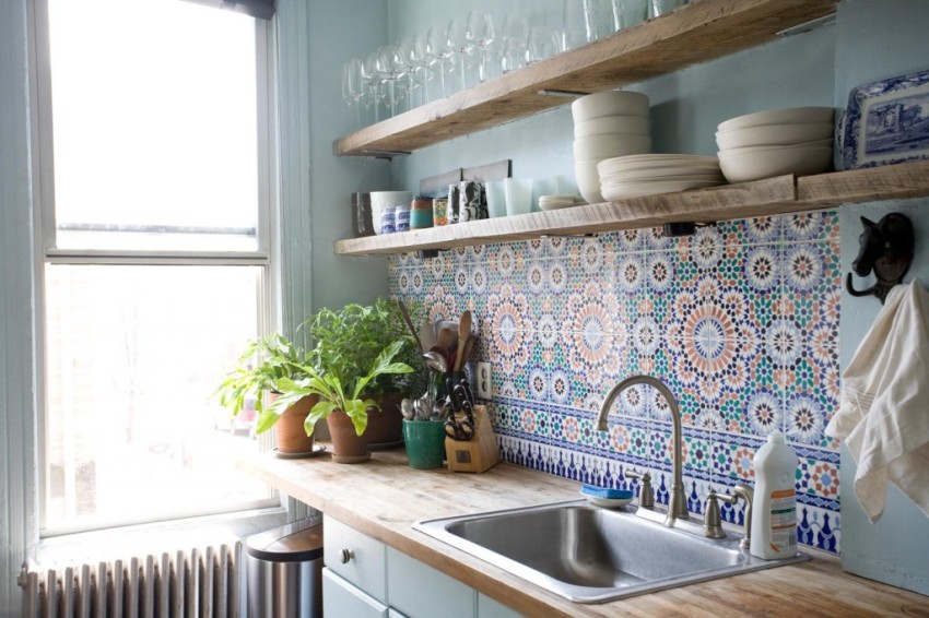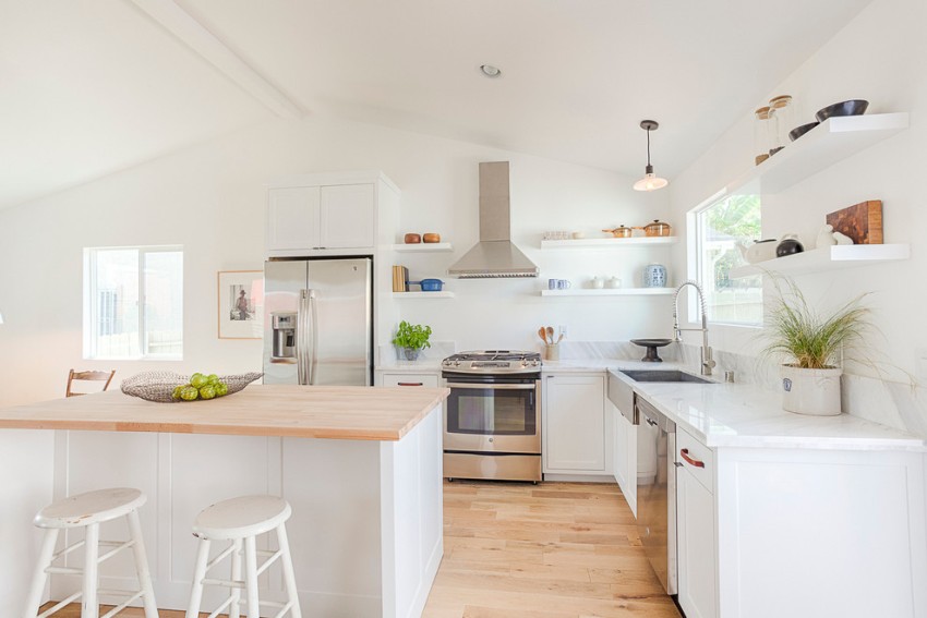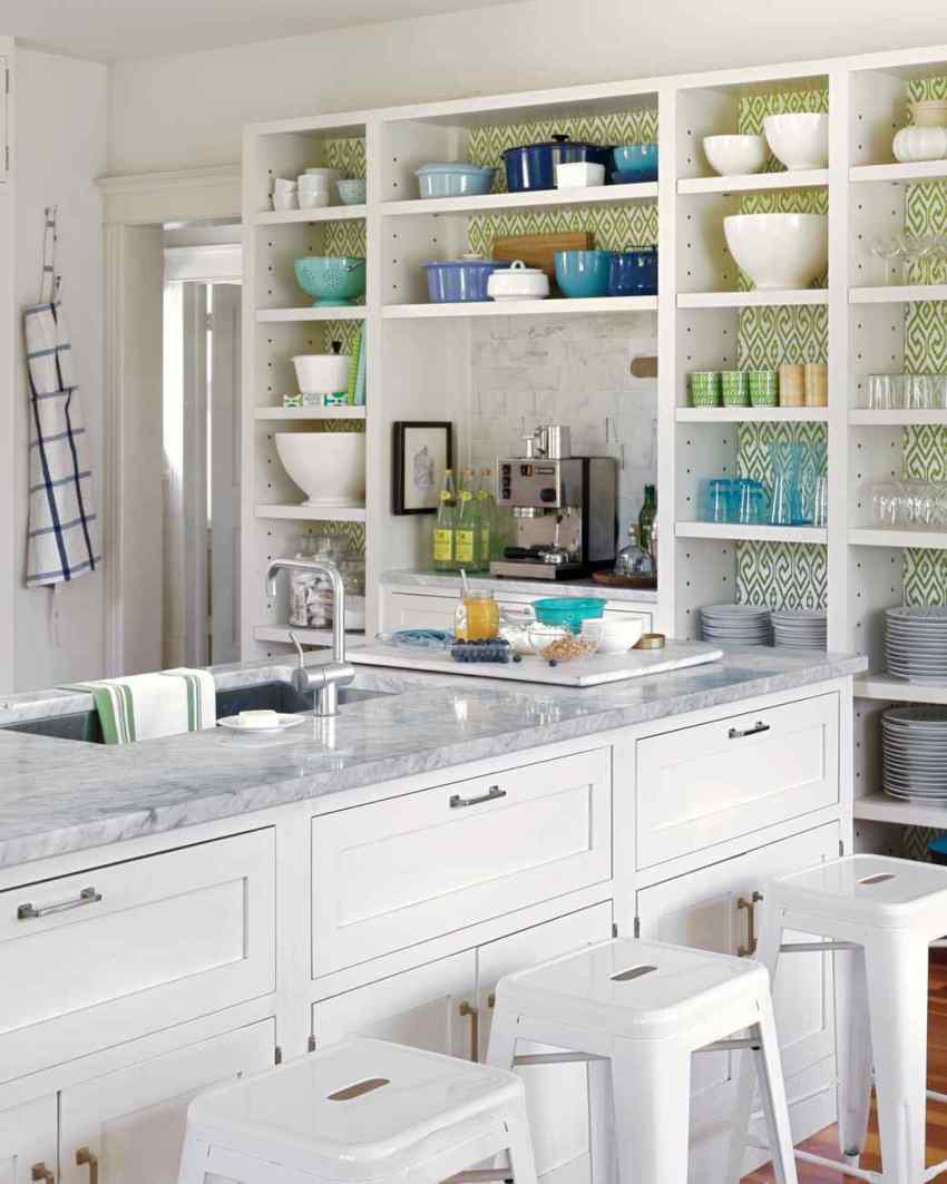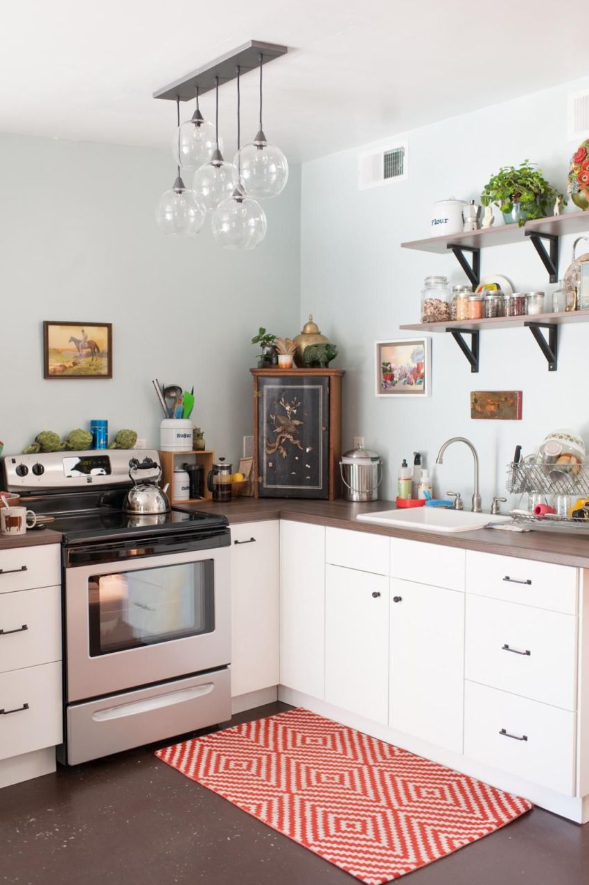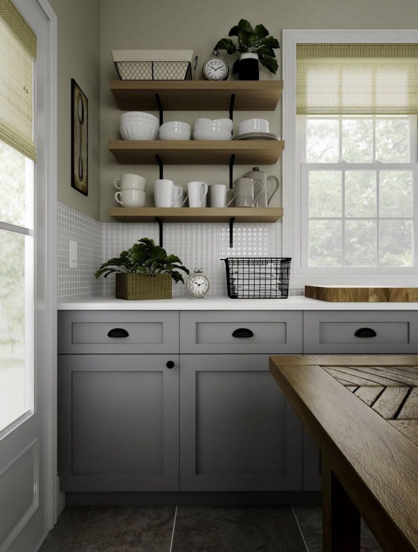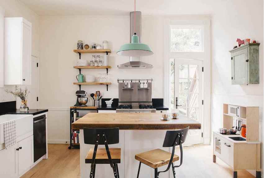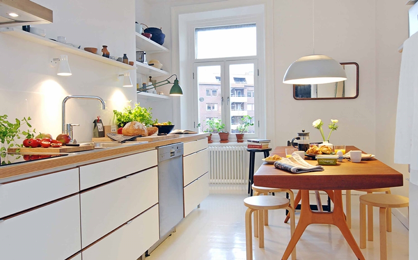 Upang hindi magulo ang espasyo ng isang maliit na kusina, sa halip na mag-hang mga cabinet, maaari mong bigyan ng kasangkapan ang mga bukas na ilaw na istante