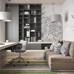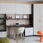 Ang isa pang pagpipilian para sa modular na kasangkapan ay isang pader na may puwang para sa isang computer desk. Mas mahusay na i-install ang kit sa kaliwang bahagi ng window upang ang lugar ng trabaho ay mahusay na naiilawan sa araw. Bilang isang resulta, hindi lamang maginhawa upang gumana sa computer, ngunit maaari mo ring gamitin ang lugar na ito para sa pagbabasa o pagsusulat.