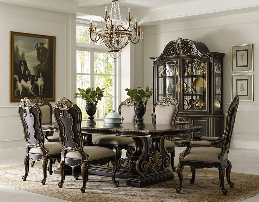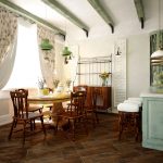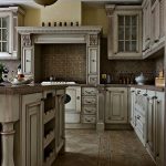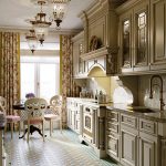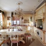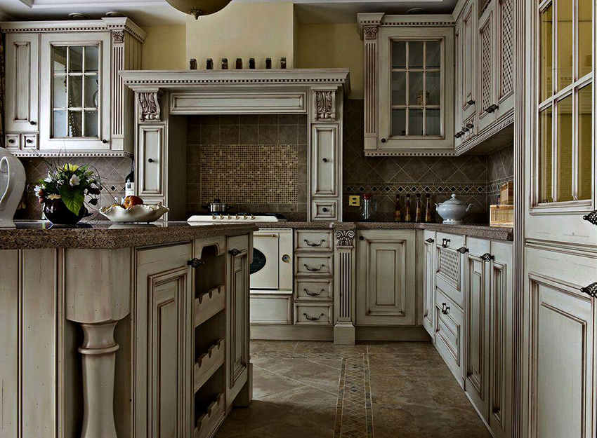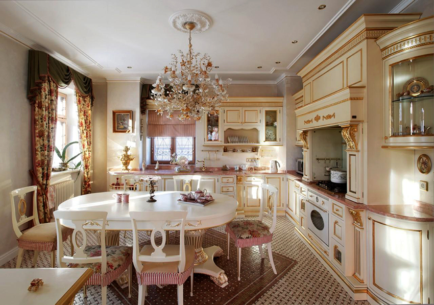 Ang mga gamit sa muwebles ay gawa sa natural na kahoy at pinalamutian ng mga larawang inukit at mamahaling ginintuang mga kabit. Ang mga puting glazed wall cabinet ay lumikha ng isang antigong epekto. Ang isang mahalagang piraso ng kasangkapan sa bahay ay isang built-in na sideboard na may bukas na mga istante at mga pintuan ng salamin, kung saan, na nagbibigay sa kuwarto ng isang espesyal na kagandahan at ginhawa, mga antigong set ng tsaa, mga kaldero ng tanso, malalaking pinggan, mga lumang banga, hinabi na mga basket at iba pang mga antigong item ay matatagpuan.