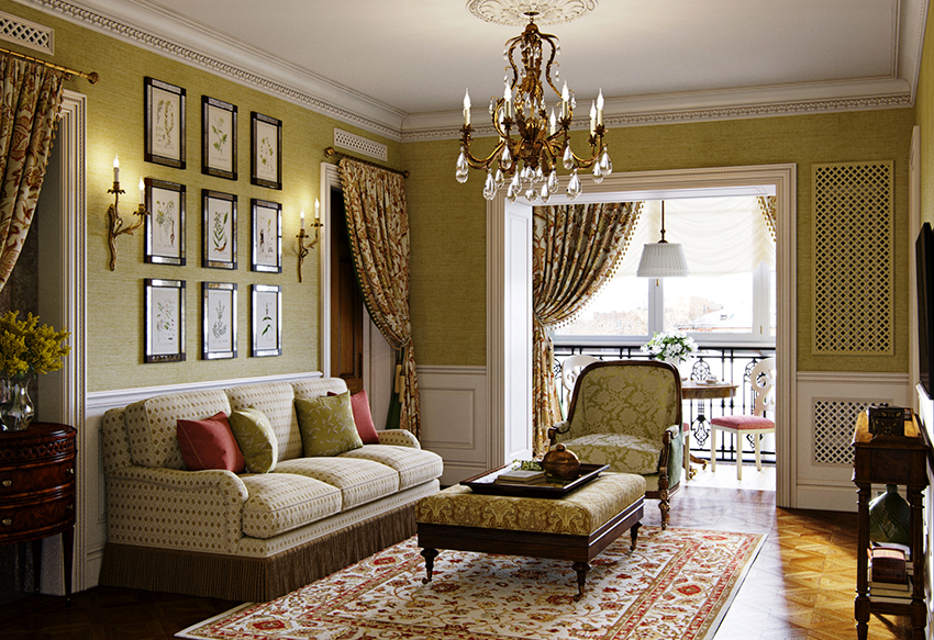Ang modernong interior sa istilong Ingles ng sala ay puno ng isang malaking bilang ng mga pandekorasyon na aksesorya sa anyo ng mga porselana na bagay, antigong mga vase, pigurin, kuwadro na gawa sa mga ginintuang mga frame. Ang sofa ay pinalamutian ng mga makukulay na unan. Sa sahig ay may isang ilaw na karpet na may mga burloloy na bulaklak.