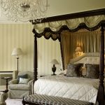 Ang pangunahing elemento ng silid ay ang king-size bed. Ang perpektong pagpipilian ay isang marangyang disenyo na gawa sa natural na solidong kahoy ng madilim na species na may isang mataas na malambot na headboard, pinalamutian ng pandekorasyon na mga larawang inukit. Dapat ito ay nasa mataas na mga binti. Ang kama ay maaaring mabakuran sa lahat ng panig ng isang ilaw at walang timbang na palyo. Mayroong sapilitan na mesa ng pagbibihis, mesa sa tabi ng kama at tumba ng upuan.