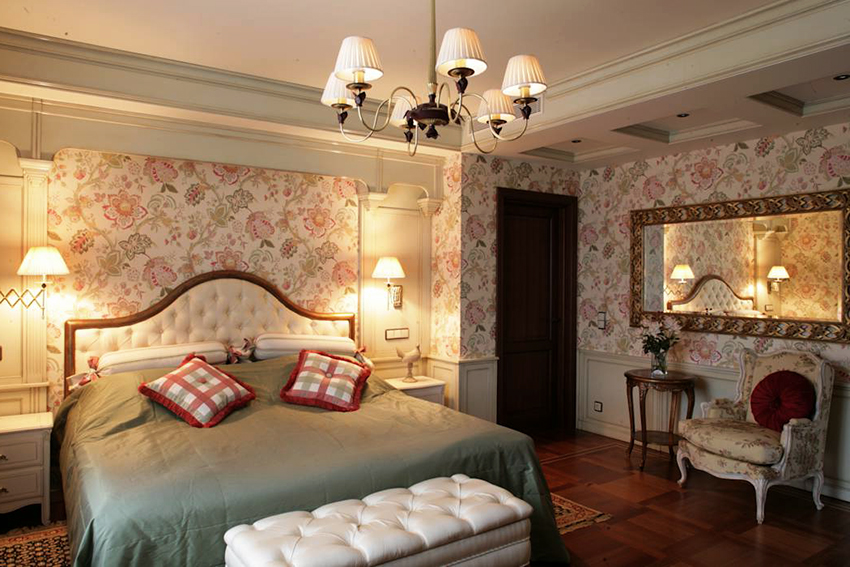 Ang isang komportable at nakakarelaks na kapaligiran ay dapat nilikha sa silid-tulugan. Maaari itong makamit sa pamamagitan ng dekorasyon ng isang silid sa istilo ng England. Ang ilaw na pinturang monochromatic ay inilalapat sa mga dingding. Ang isa sa mga ito ay maaaring madagdagan ng mga disenyo ng bulaklak.