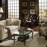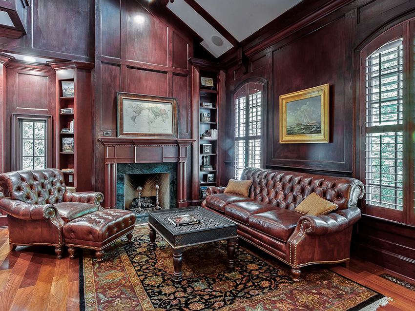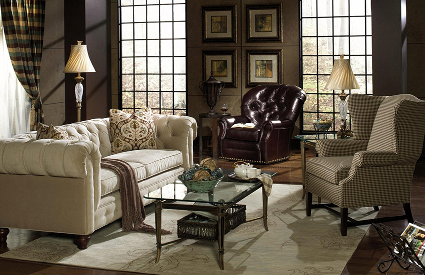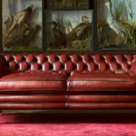 Ang lugar ng karangalan ay inookupahan ng isang sofa sa istilong English Chesterfield, na maaaring gawin sa iba't ibang mga interpretasyon. Bilang tapiserya, ang mga canvases ng tela sa iba't ibang kulay o natural na katad ng isang madilim na tsokolate shade ay ginagamit.