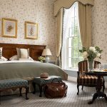 Ang loob ng silid tulugan ng British ay magkakasya sa guhit na wallpaper, plaid o floral print. Ang mga takip sa tela, embossing at pag-screen ng seda ay magiging kawili-wili at naaangkop. Maaaring isama ang wallpaper sa mga panel ng kahoy, na pumupuno sa isang katlo ng kabuuang taas ng pader. Ang iba't ibang mga pagpipilian sa disenyo ay ipinapakita sa larawan ng panloob na silid-tulugan sa istilong Ingles.