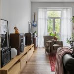 Gayundin, huwag kalimutan ang tungkol sa pag-install ng TV. Siyempre, ang pinakaangkop na pagpipilian para sa odnushki ay mga aparato na may likidong kristal at semiconductor (LED) na mga monitor. Inirerekumenda na i-mount ang naturang aparato sa mga swivel braket. Ang mga elemento ng tunog ay maaaring nakaposisyon sa mga gilid o sa kisame.