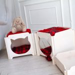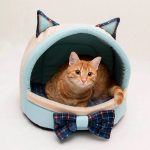 Mas gusto ng ilang mga artesano na palamutihan ang loob ng mini-kasangkapan para sa mga pusa, na parang mga laruang sofa, kama, ottoman o upuan. Ang tanging bagay na nakikilala ang mga ito ay ang nadagdagan na laki ng huli.Ang mga mahilig sa pusa ay madalas na nag-i-install ng mga pet bed sa kanilang silid, ginawa sa parehong istilo ng kama ng may-ari, o pinalamutian din ng isang canopy. Sa kasong ito, mahalagang manahi ng isang naaalis na matibay na takip na maaaring madaling maayos.