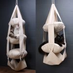 Upang makagawa ng isang malambot na bahay para sa isang pusa gamit ang iyong sariling mga kamay, hindi mo kailangang gumawa ng isang matatag na base. Ang disenyo ay isang klasikong duyan na umaabot sa pagitan ng mga binti. Ang produkto ay maaaring maayos sa pagitan ng mga binti ng isang mesa, upuan o sa sulok ng silid. Ang isang makabuluhang bentahe ng nasuspindeng istraktura ay ang pag-save ng space, dahil hindi ito kinakailangan na gamitin ang magagamit na lugar ng silid.