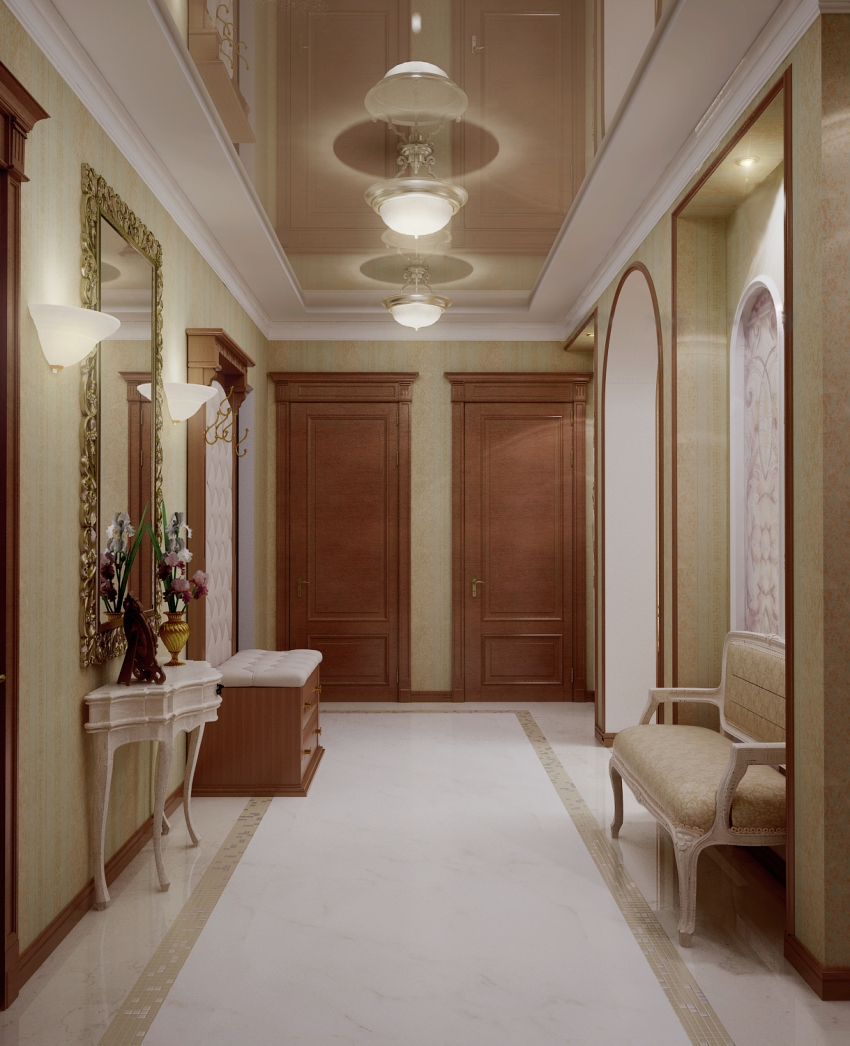 Kapag pinalamutian ang mga koridor sa isang klasikong istilo, bilang isang panuntunan, ginagamit ang mga mahinahon na kulay.