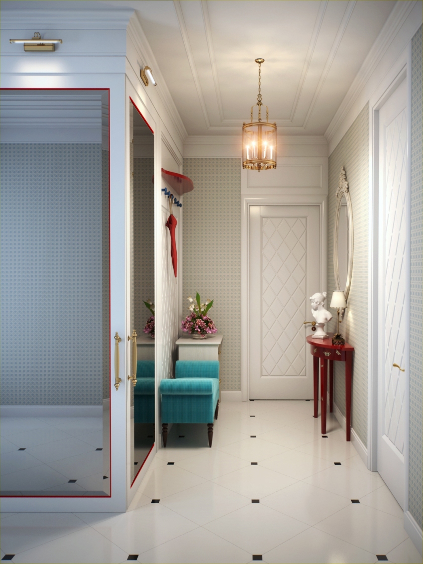Kung ang lugar ng pasukan ay may tamang hugis ng geometriko, dapat walang mga problema sa disenyo ng silid. Nalalapat ang panuntunang ito sa mga parihaba at parisukat na pasilyo. Hindi ito magiging mahirap para sa may-ari ng gayong silid na lumikha ng isang simetriko na panloob na nakakatugon sa lahat ng mga pamantayan ng klasikong istilo.