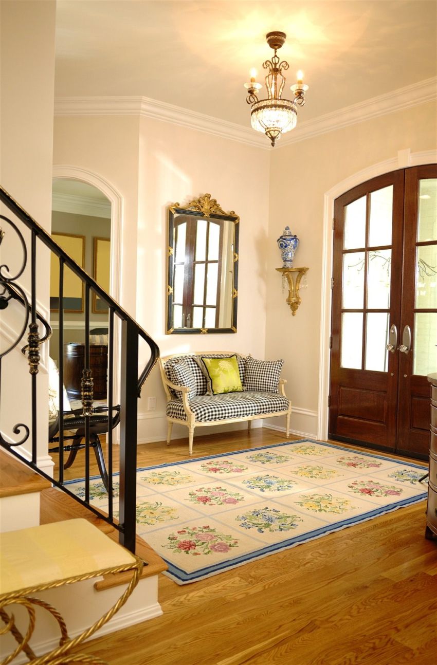 Ang mga kasangkapan sa bahay ay dapat na simetriko. Mas mabuti kung ang tamang mga geometriko na hugis at malinaw na mga linya ang mangingibabaw sa disenyo. Ang mga haligi, larawang inukit at iba pang mga detalye ay maaaring magamit bilang dekorasyon. Ito ay kanais-nais na ang isang multi-level na sistema ng pag-iilaw ay mai-install sa pasilyo, na nagbibigay para sa pagpasok ng ilaw sa bawat sulok ng silid.