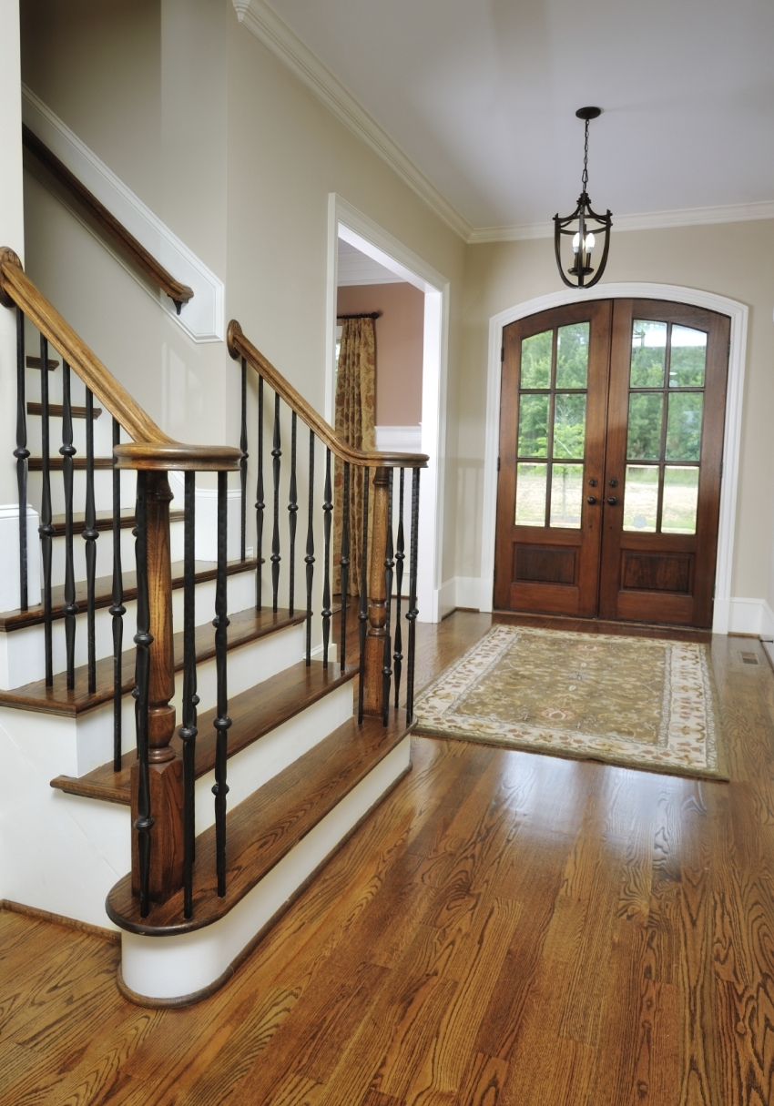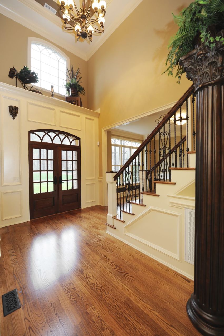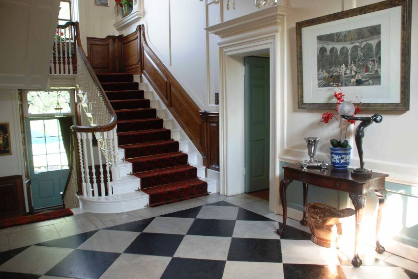 Disenyo ng isang malaking pasilyo na may isang hagdanan sa isang pribadong bahay
