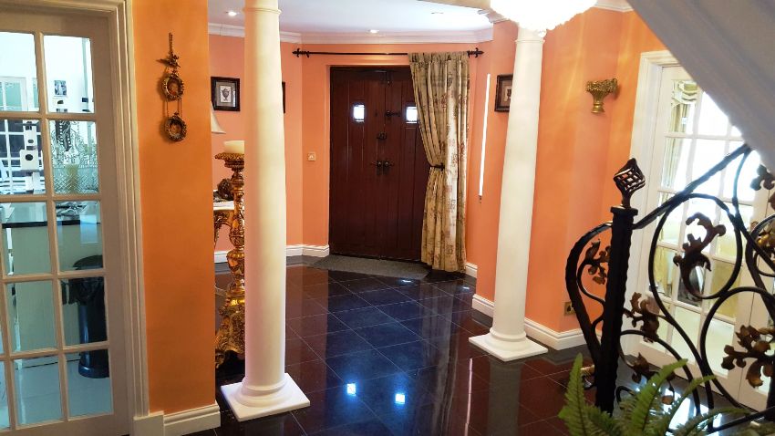 Ang isang entrance hall na sinamahan ng isang sala ay isang tanyag na pagpipilian ng layout para sa isang malaking bahay