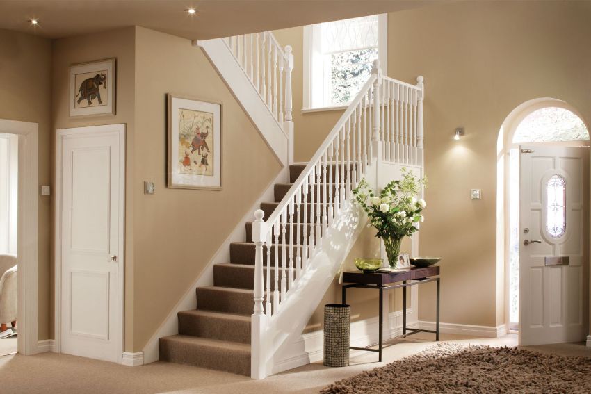 Ang pangkalahatang pakiramdam ng pasilyo ay nakasalalay sa disenyo ng mga hagdan at mga materyales na kung saan ito ginawa