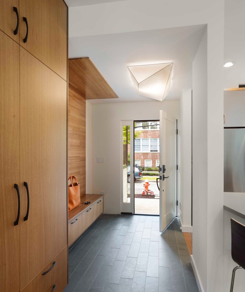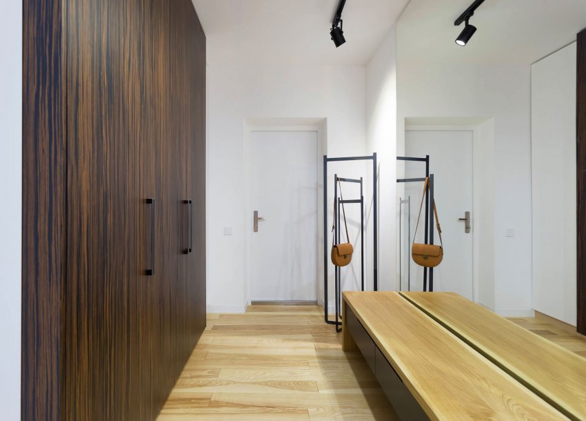 Ang isang makitid na pasilyo ay maaaring magsama ng mga nakatagong kasangkapan na naka-mount sa mga dingding, hindi lamang ito nakakatipid ng puwang, ngunit ginagawang mas maginhawa at gumana ang pasilyo.