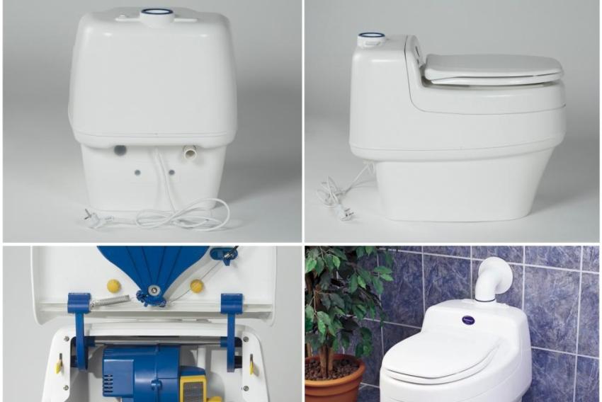 Ang mga de-koryenteng aparato ay maaari lamang mai-install nang permanente, dahil dapat silang konektado sa network. Iyon ang dahilan kung bakit ang gayong upuan ay may problema upang mai-install banyo sa labas... Ngunit kasiyahan na gumamit ng gayong banyo. Gumagana ito sa prinsipyo ng paghihiwalay ng mga solid at likidong sangkap mula sa bawat isa. Ang mga solido ay nakolekta at pinatuyong sa isang magkakahiwalay na bahagi ng tangke ng imbakan.Ang likido ay pumapasok sa isa pa at pinatuyo nang manu-mano o gumagamit ng isang maginoo na medyas. Ang kasamang bentilasyon ng tubo ay may kakayahang alisin ang lahat ng hindi kinakailangang mga amoy at gas.